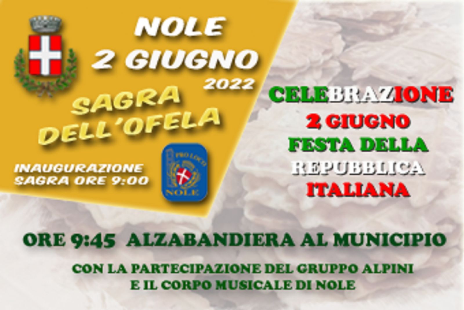 Giovedì 2 giugno 2022, festa della Repubblica, ore 9,45 alzabandiera al municipio con la partecipazione del Gruppo Alpini di Nole e del Corpo Musicale di Nole.