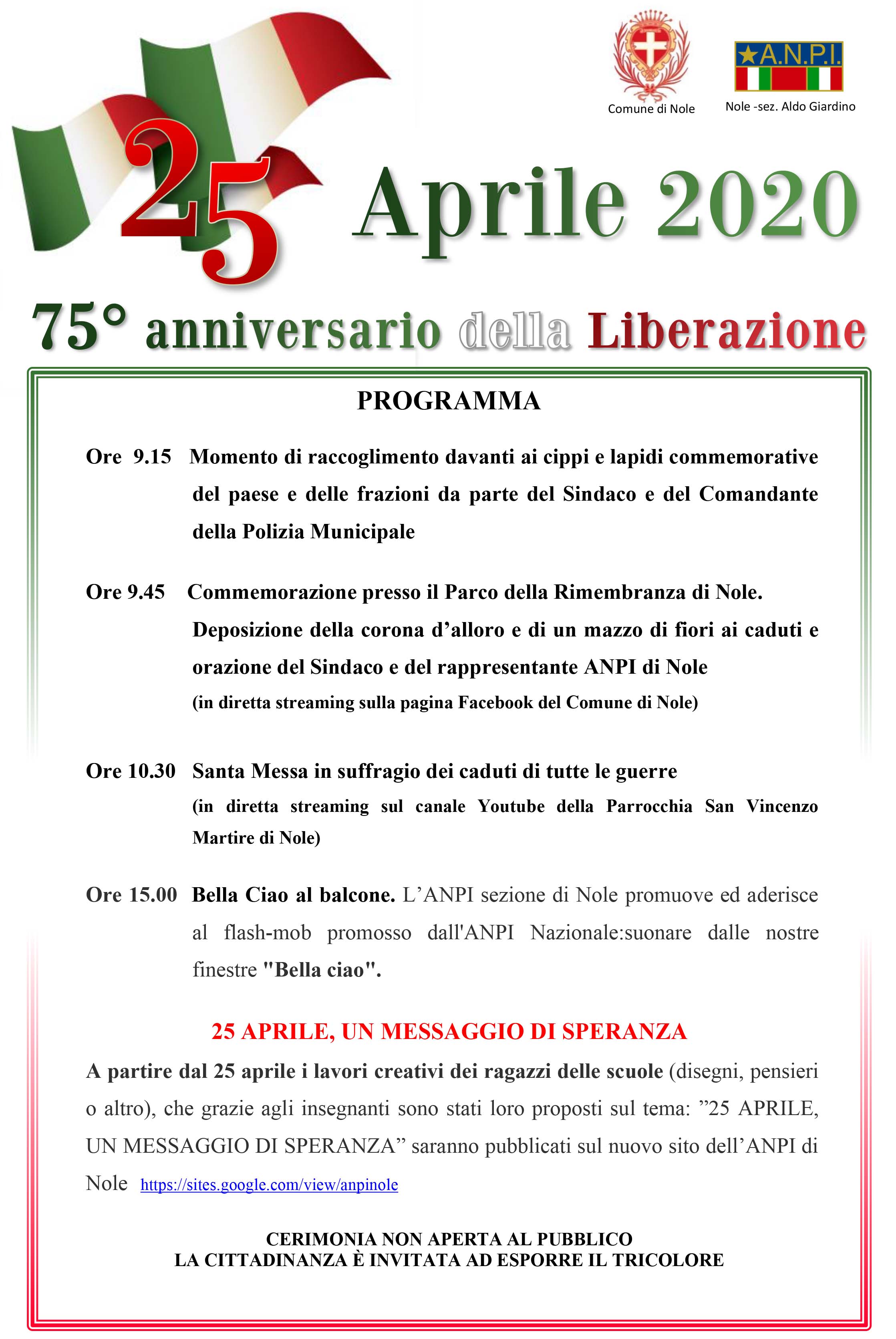 L’Amministrazione di Nole con l’ANPI locale hanno comunque deciso di celebrare il ricordo di questa importante data della nostra storia con una cerimonia ristretta e non aperta al pubblico, nel rispetto delle disposizioni vigenti, ma in condivisione con la cittadinanza attraverso una programmazione digitale.