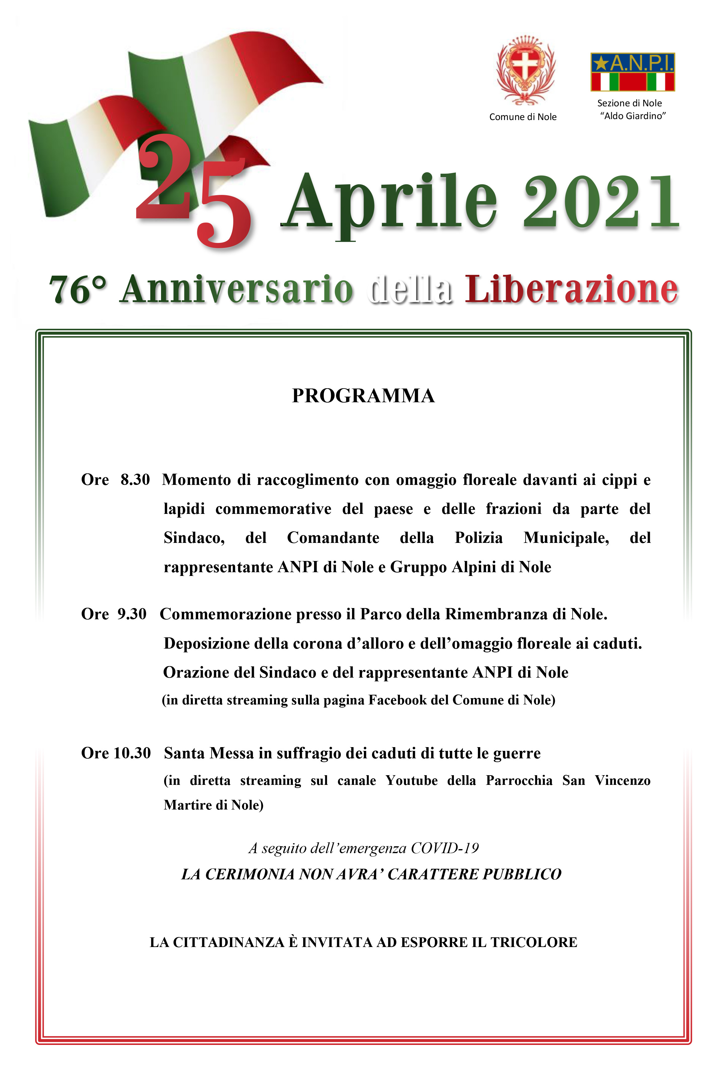 L’Amministrazione di Nole con l’ANPI locale celebreranno il ricordo di questa importante data della nostra storia con una cerimonia ristretta e non aperta al pubblico, nel rispetto delle disposizioni vigenti, ma in condivisione con la cittadinanza attraverso una programmazione digitale trasmessa in diretta streaming sulla pagina facebook del Comune di Nole.