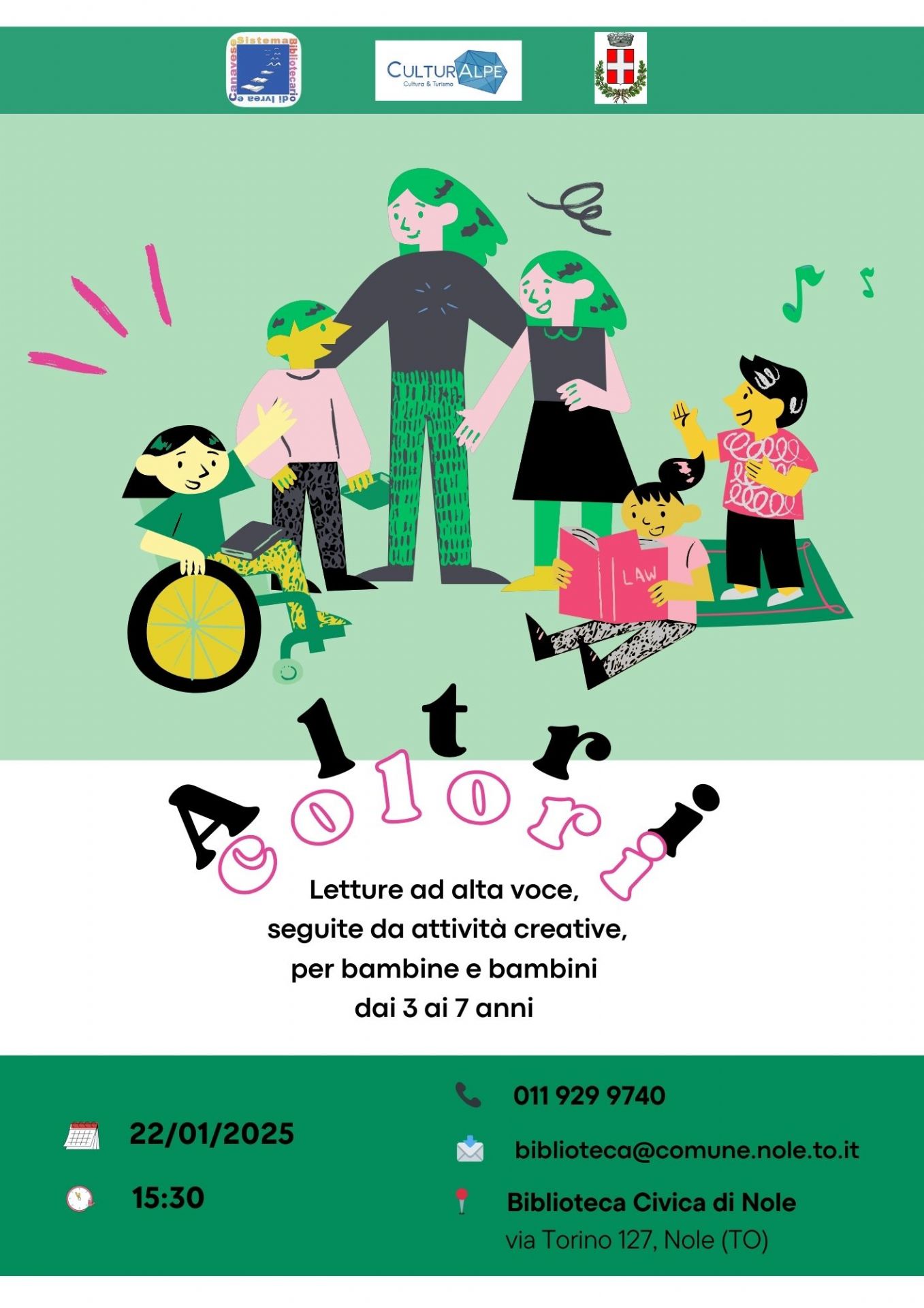 In occasione della festa patronale di mercoledì 22 Gennaio, la biblioteca civica di Nole organizza delle letture ad alta voce, seguite da attività creative, per bambine e bambini dai 3 ai 7 anni.