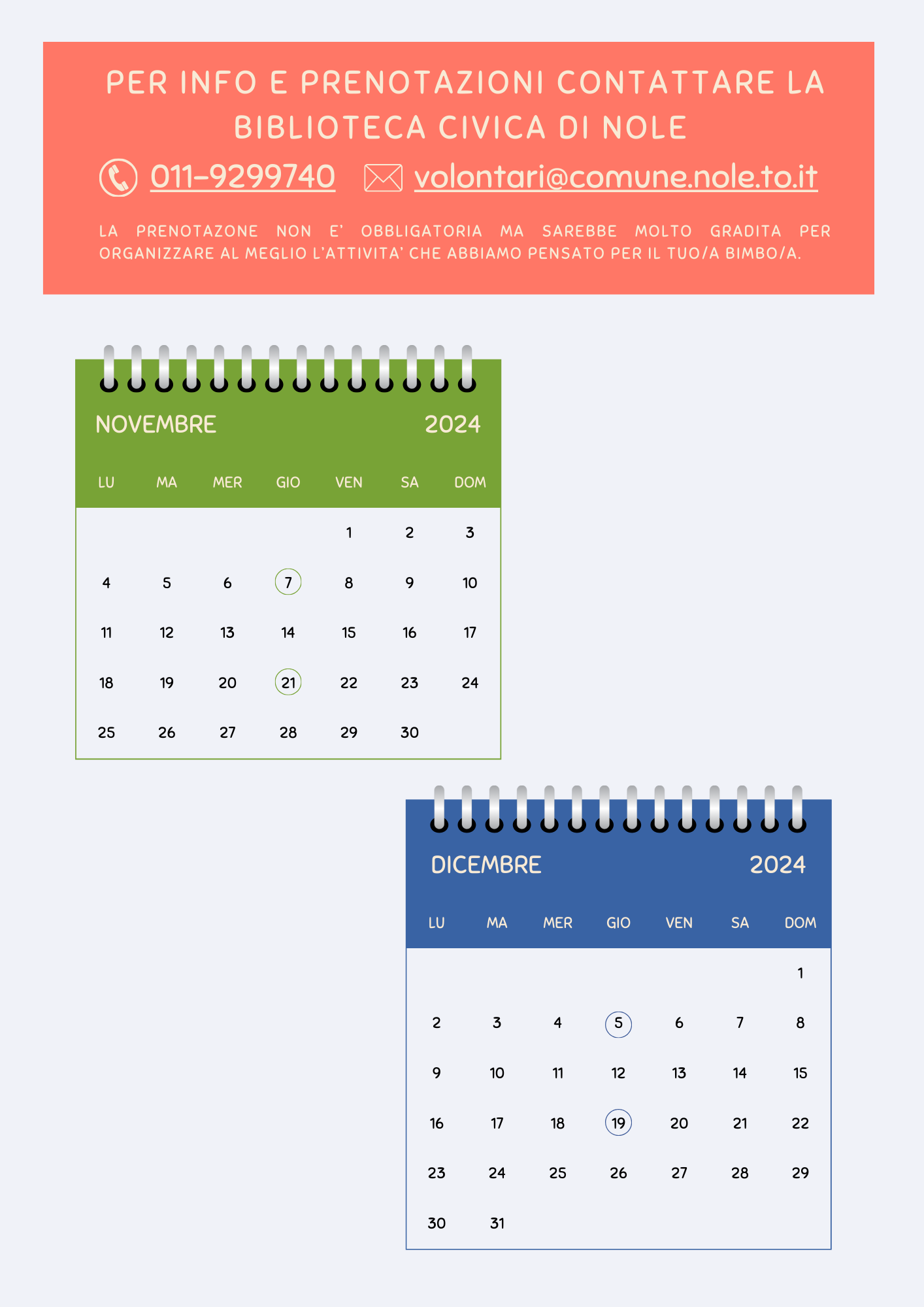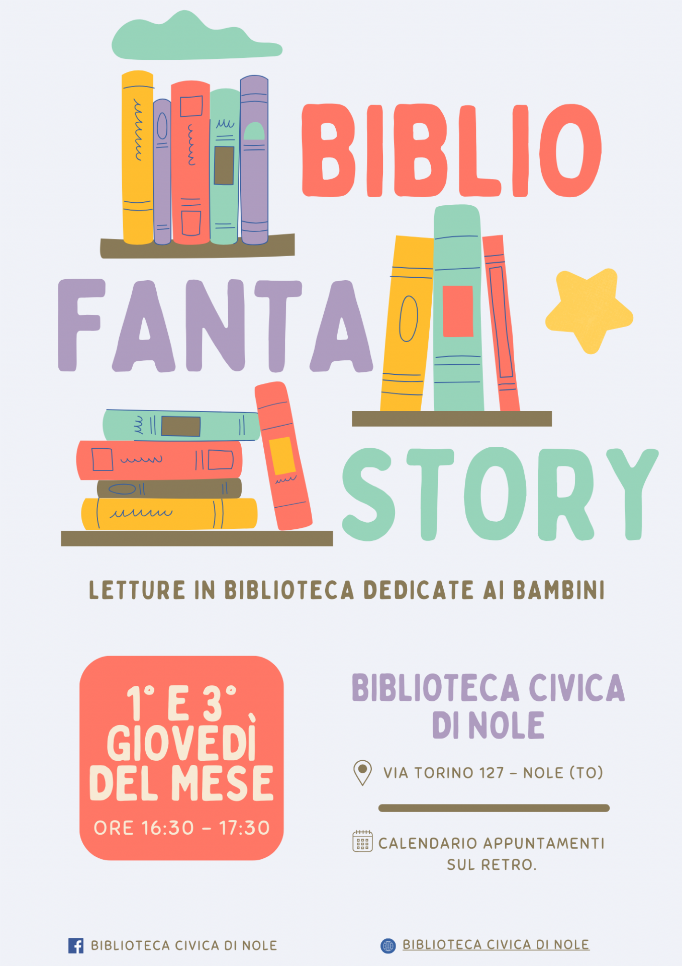 Le letture si terranno nella Sala lettura della Biblioteca Civica di Nole il 1° e il 3° giovedì del mese alle ore 16:30.