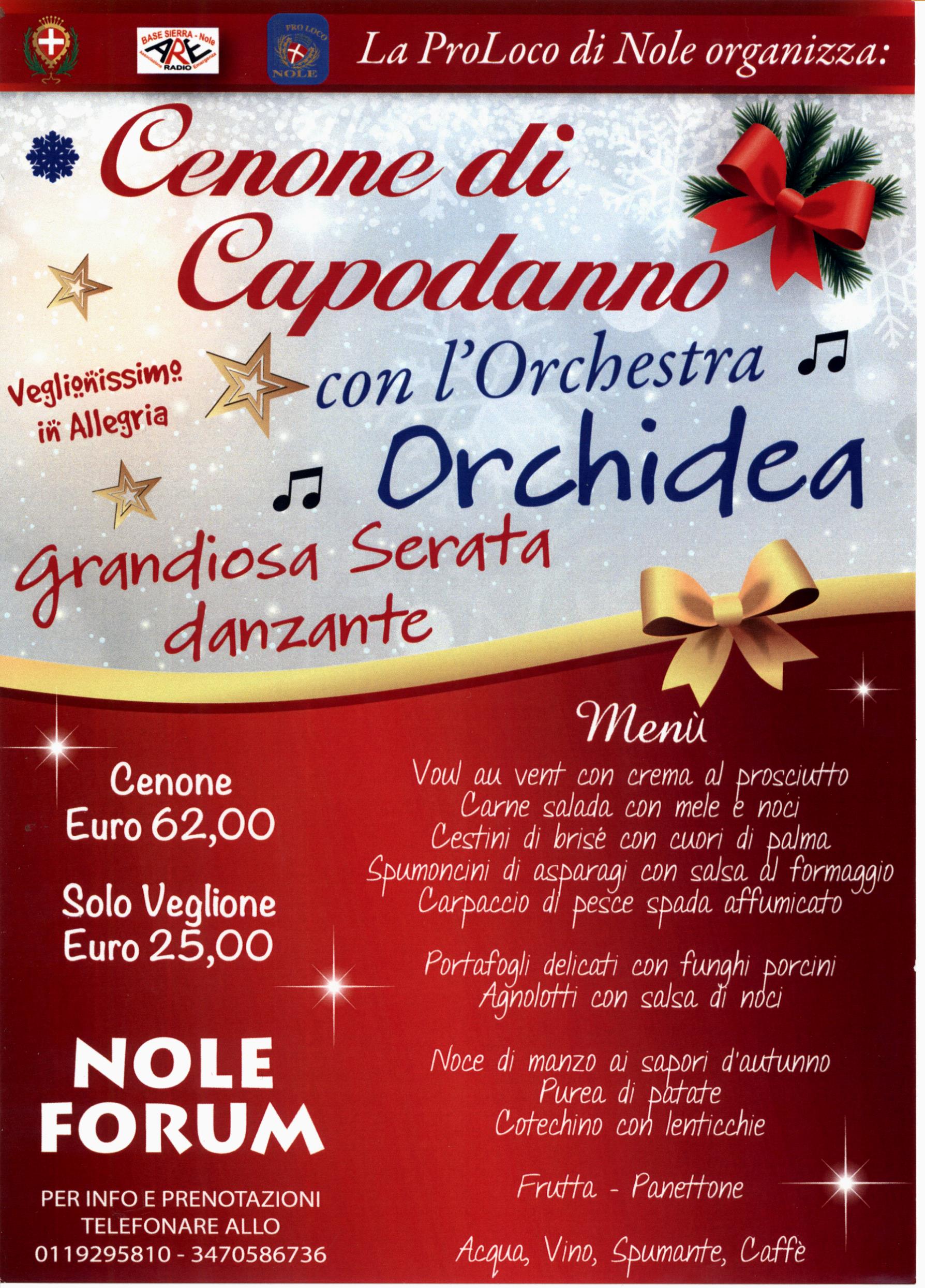 La Pro Loco di Nole, con il patrocinio del Comune e la collaborazione di Radio Emergenza, organizza il cenone di capodanno con l'orchestra "Orchidea", veglione in allegria e serata danzante.