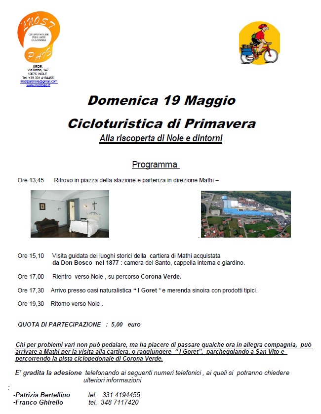 Il gruppo nolese per l'arte e la storia "'L nòst pais" organizza per domenica 19 maggio 2019 la cicloturistica di primavera: "ALLA RISCOPERTA DI NOLE E DINTORNI".