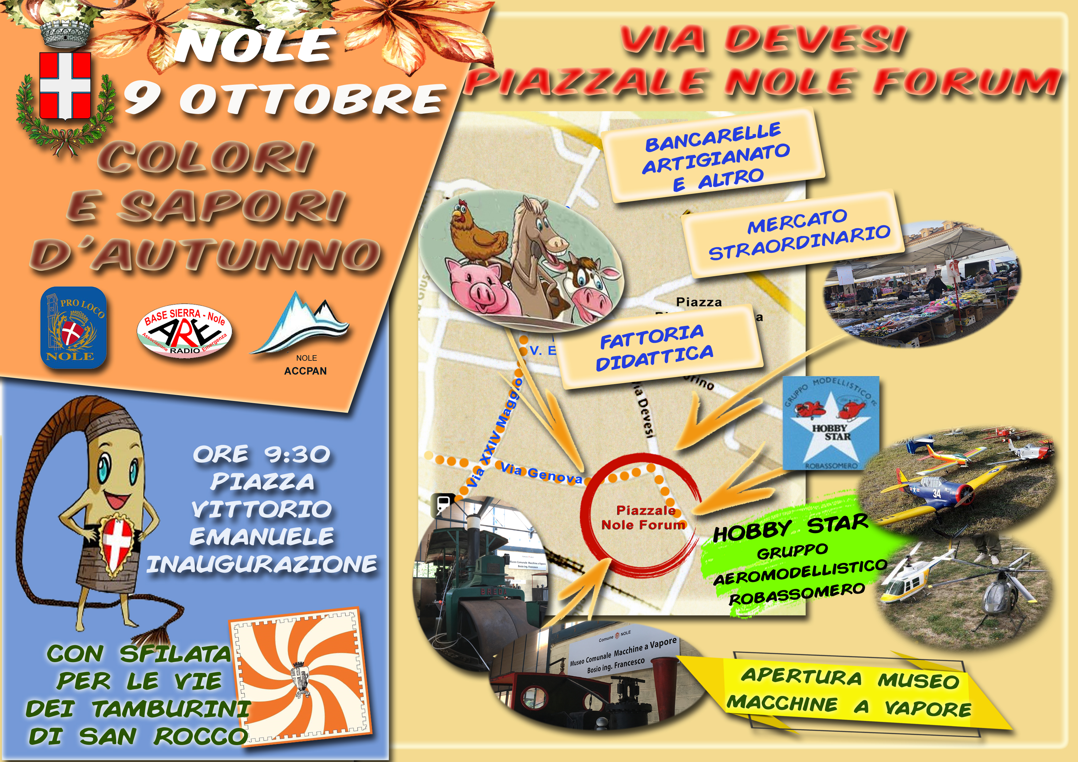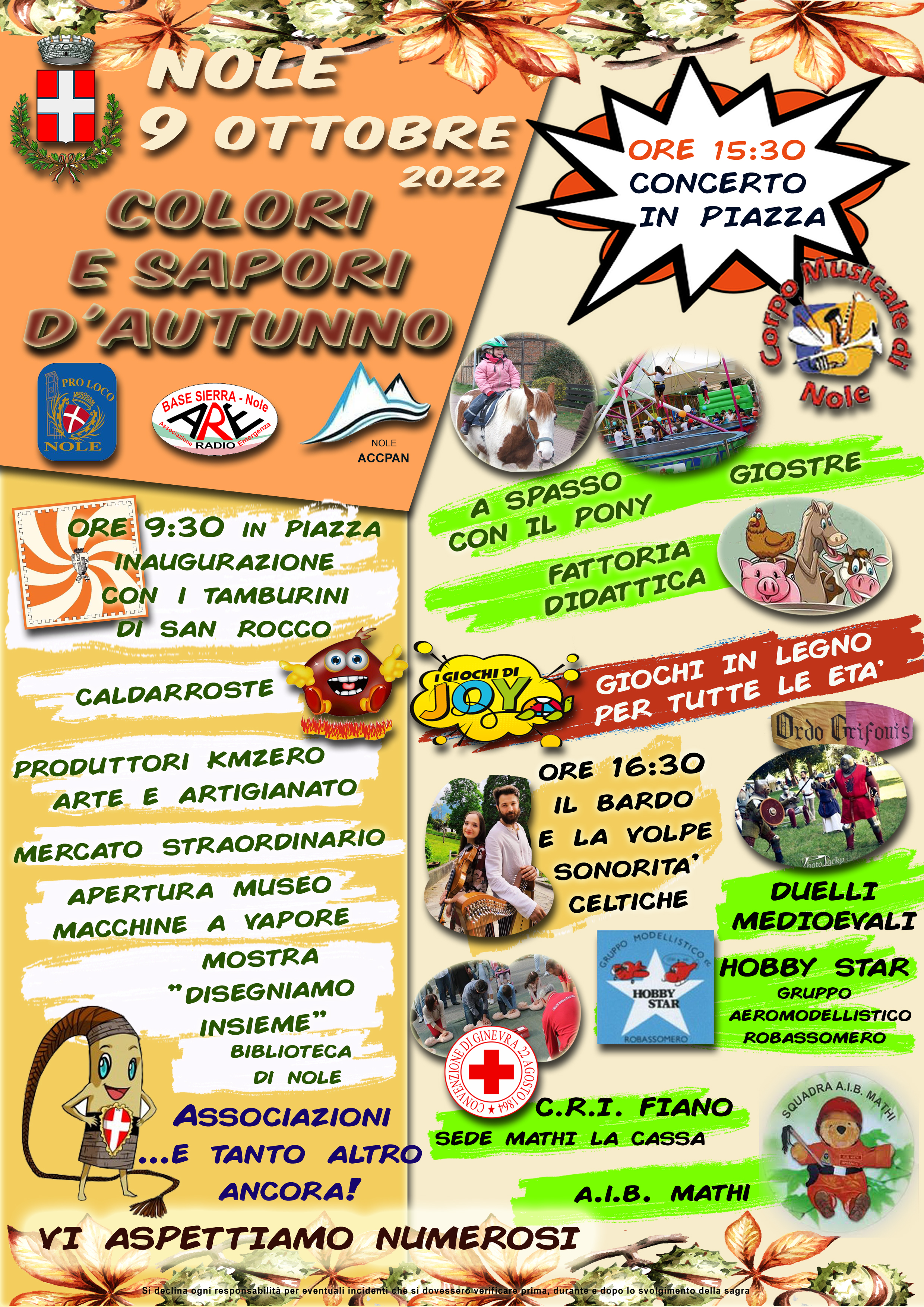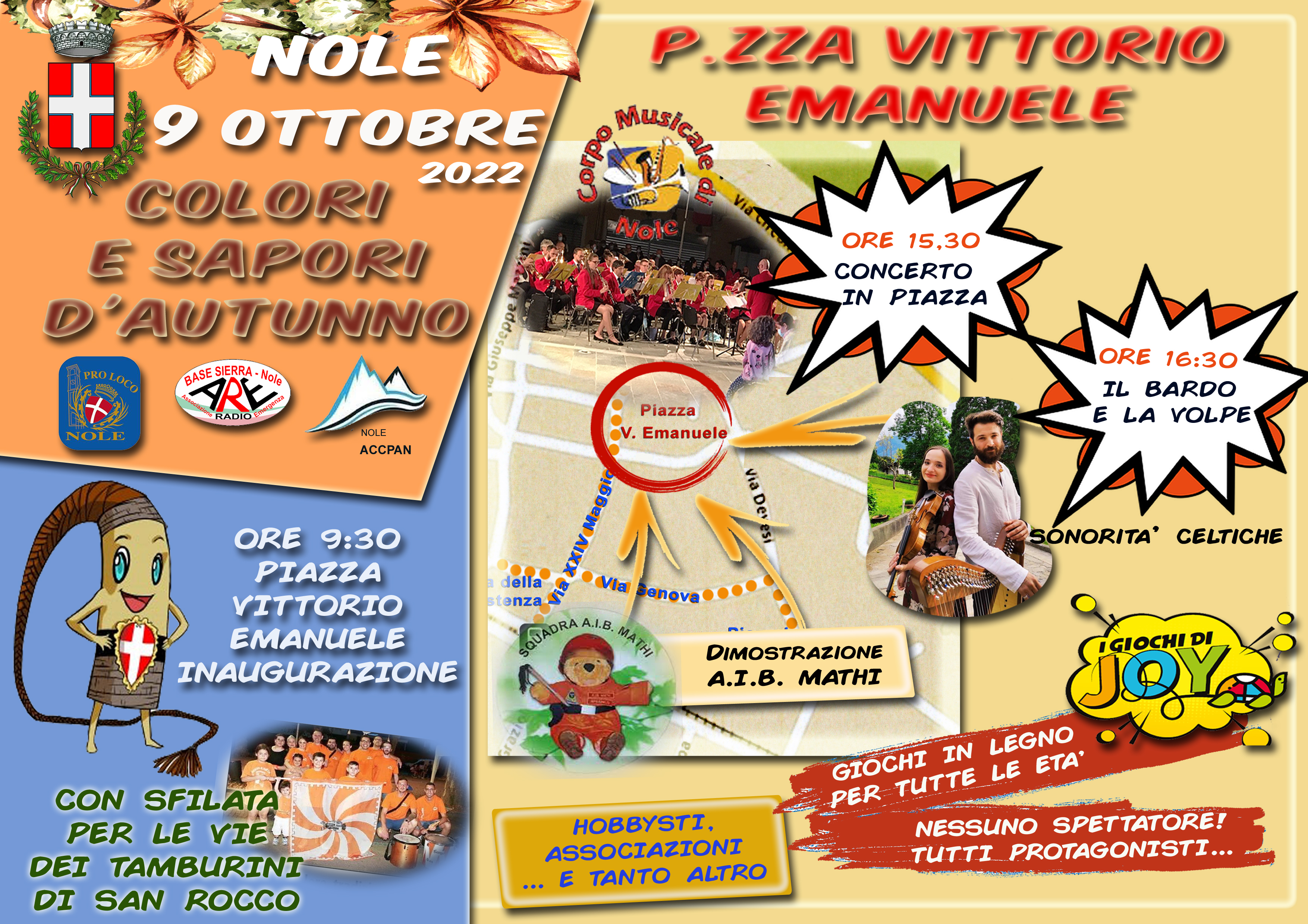 Domenica 9 ottobre 2022 si terrà la fiera "Colori e sapori d'autunno". -Inaugurazione alle 9,30 in piazza Vittorio Emanuele con i tamburini di San Rocco. -Ore 15,30 concerto in piazza del Corpo Musicale di Nole; -Ore 16,30 sonorità celtiche con "Il bardo e la volpe".