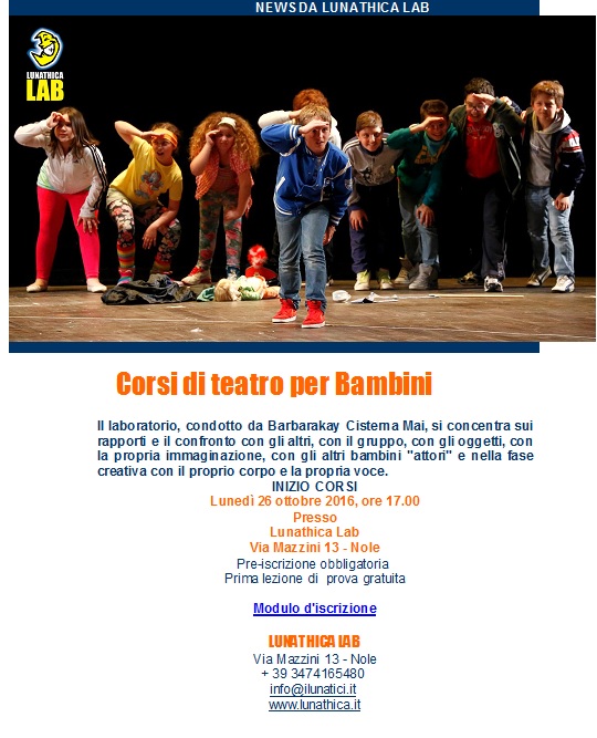 Lunathica Lab presenta i corsi teatrali per bambini 2016/2017 (da ottobre a gennaio). Il laboratorio si concentra sui rapporti e il confronto con gli altri, con il gruppo,con gli oggetti, con la propria immaginazione, con gli altri bambini "attori".