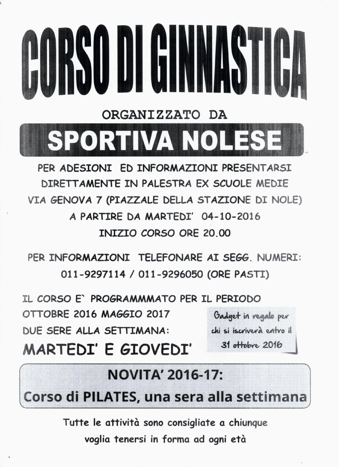 La Sportiva Nolese organizza, da ottobre a maggio, un corso di ginnastica presso la palestra di via Genova 7 (piazzale stazione), a partire dal 4 ottobre, il martedì e il giovedì, dalle ore 20,00.