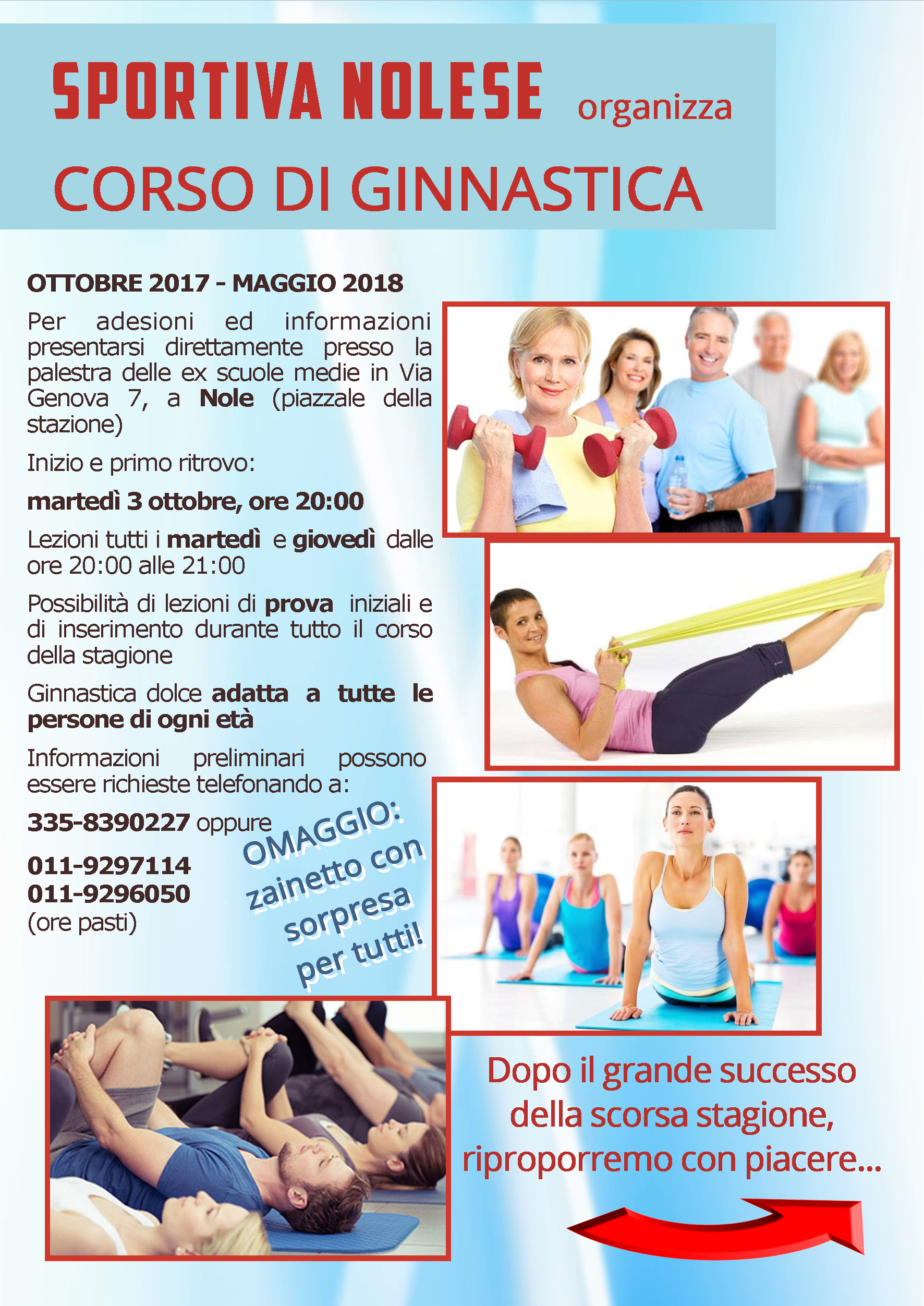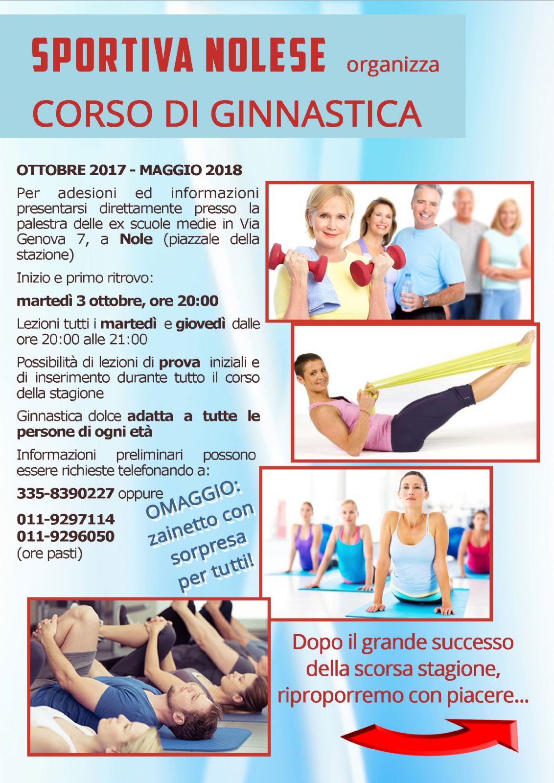 La Sportiva Nolese organizza un corso di ginnastica presso la palestra di via Genova da ottobre 2017 a maggio 2018..