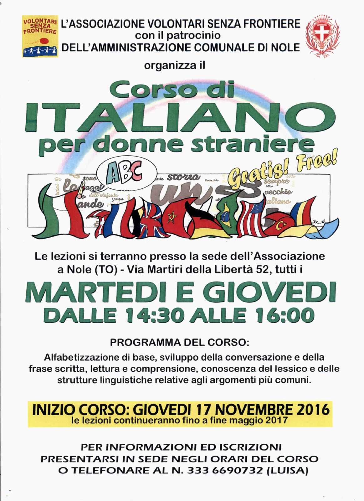L'Associazione Volontari senza Frontiere, con il patrocinio del Comune di Nole, organizza un CORSO DI ITALIANO gratuito PER DONNE STRANIERE.