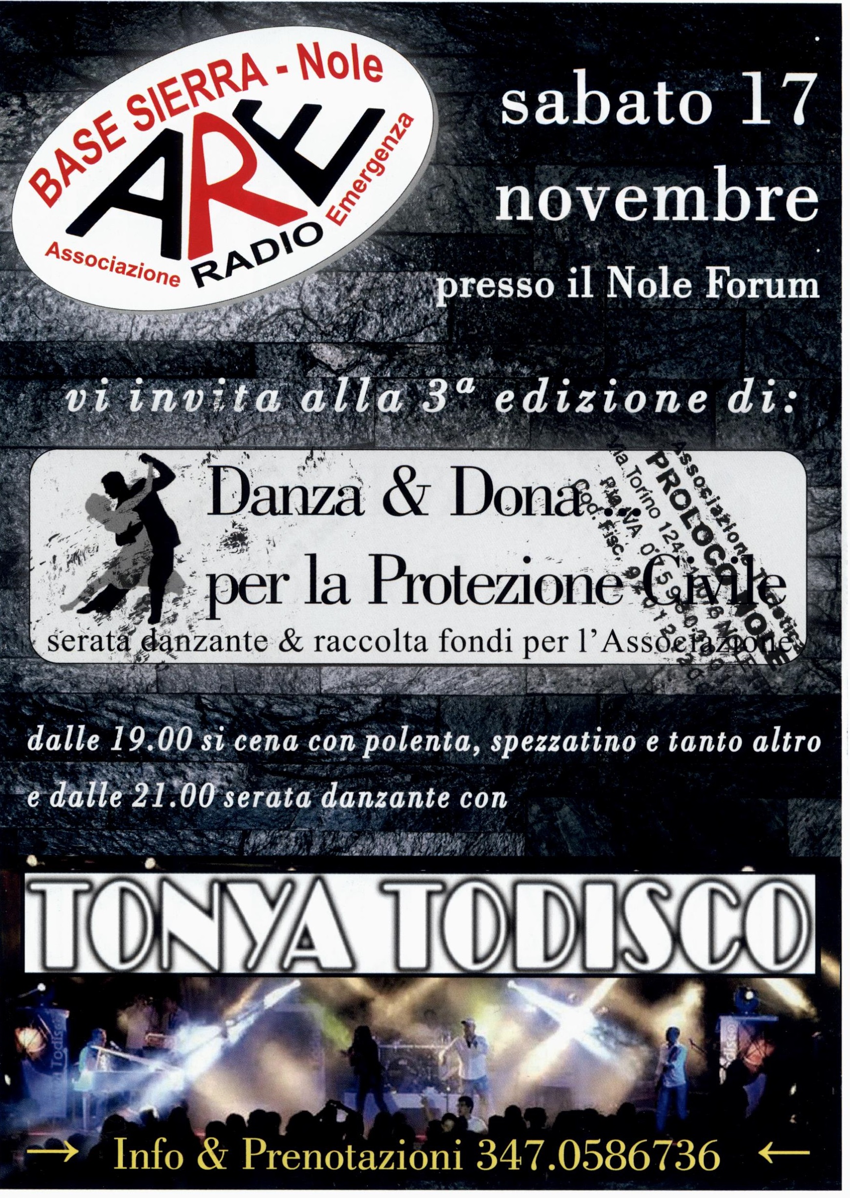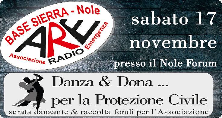 L'Associazione "Radio Emergenza" lancia la terza edizione de "Danzo & dona per la protezione civile", serata danzante di festa e beneficenza. che si terrà sabato 17 novembre 2018 presso la struttura polivalente "Nole forum" di via Devesi.
