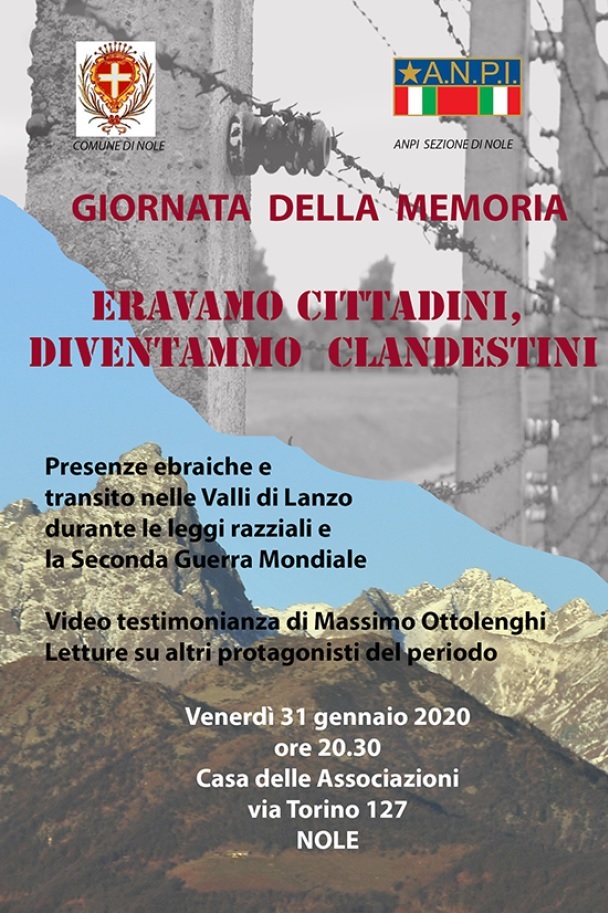 Nell'ambito delle iniziative per la "Giornata della Memoria", l'ANPI (con il patrocinio del Comune di Nole) organizza "Eravamo cittadini, diventammo clandestini", presenze ebraiche e transito nelle Valli di Lanzo durante le leggi razziali e la seconda guerra mondiale.