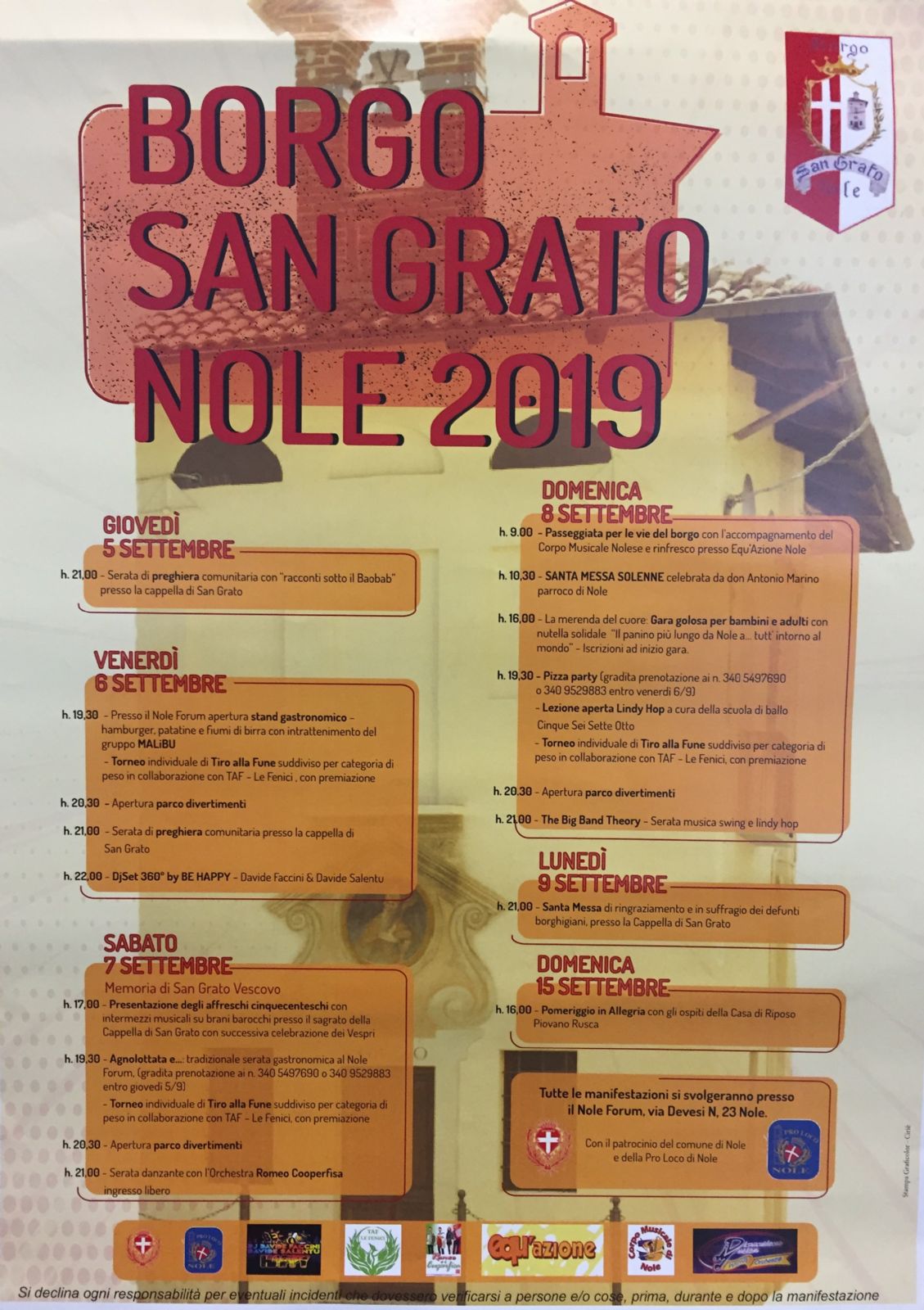 -Sabato 7 settembre: ore 17,00 presentazione degli affreschi cinquecenteschi con intermezzi musicali su brani barocchi presso il sagrato della cappella di S.Grato e successiva celebrazione dei vespri; ore 19,30 agnolottata (prenotazione 3405497690 oppure 3409529883 entro giovedì 5/9); Torneo individuale di tiro alla fune suddiviso per categorie di peso in collaborazione con TAF-Le Fenici e premiazione; ore 20,30 apertura parco divertimenti; ore 21,00 serata danzante con l'orchestra Romeo Cooperfisa (ingresso libero).