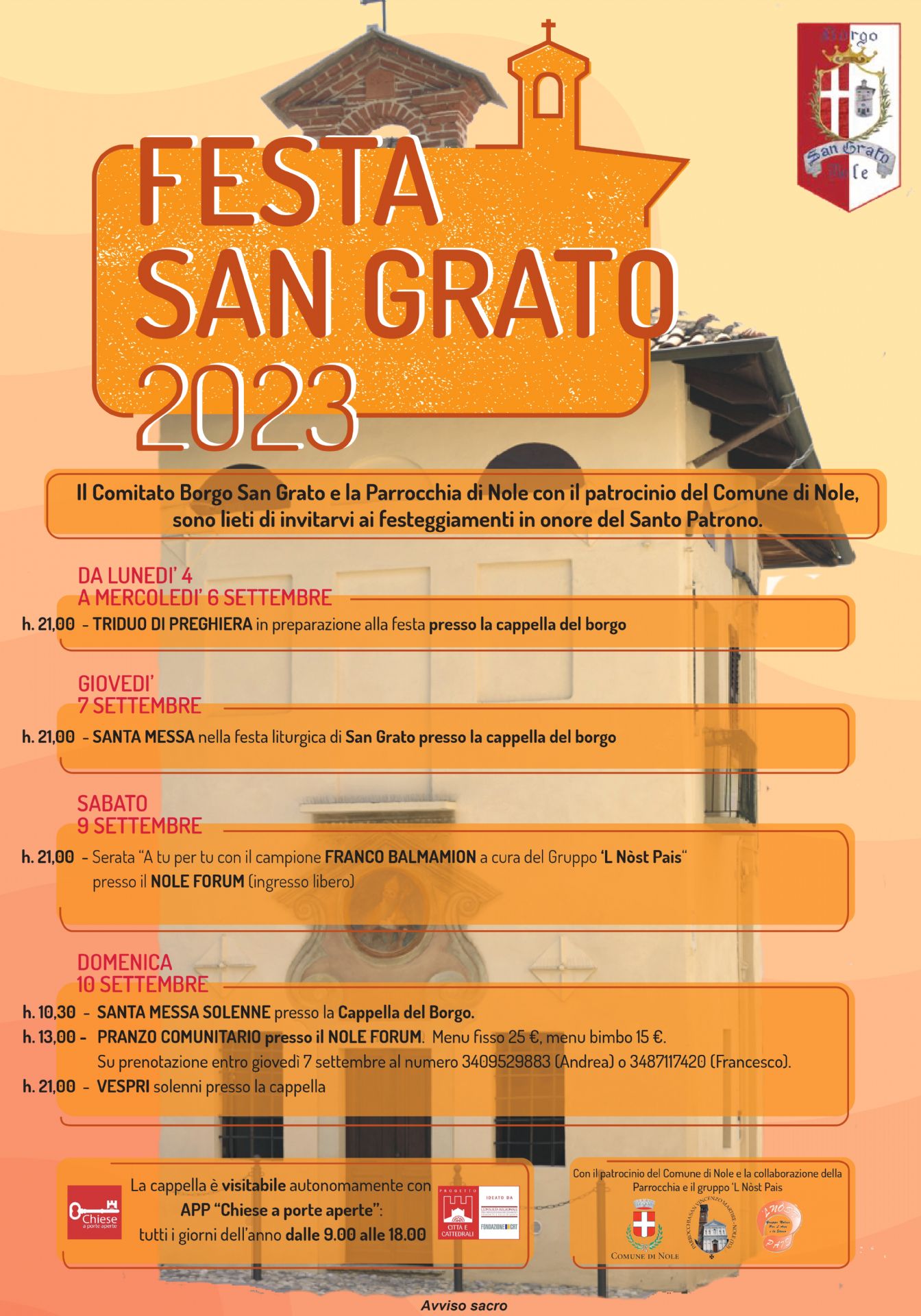 Si invita la popolazione a partecipare alla Festa di San Grato edizione 2023.