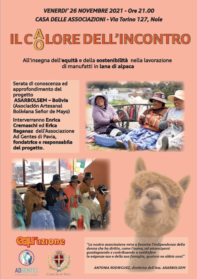 Equ'azione, con il patrocinio del Comune di Nole, organizza una serata all'insegna della equità e della sostenibilità nella lavorazione di manufatti in lana di alpaca.