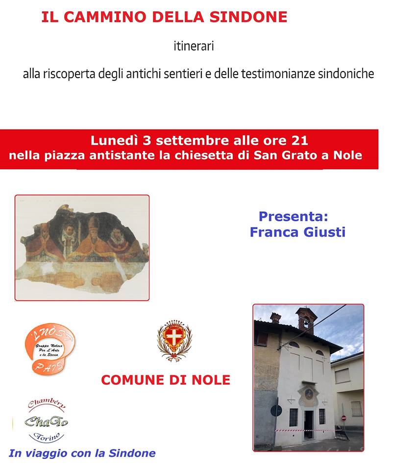 Lunedì 3 settembre 2018, alle ore 21,00, nello spazio antistante la cappella di S.Grato, si terrà la presentazione de "Il cammino della Sindone", alla riscoperta degli antichi sentieri e delle testimonianze sindoniche.
