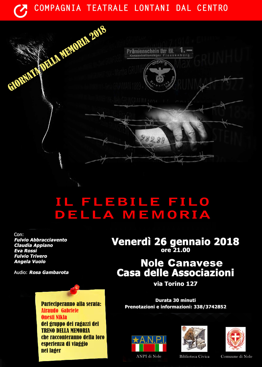 In concomitanza con il "giorno della memoria", l'ANPI di Nole sez. "Comandante Aldo Giardino" e la compagnia teatrale "Lontani dal centro" organizzano "Il flebile filo della memoria".