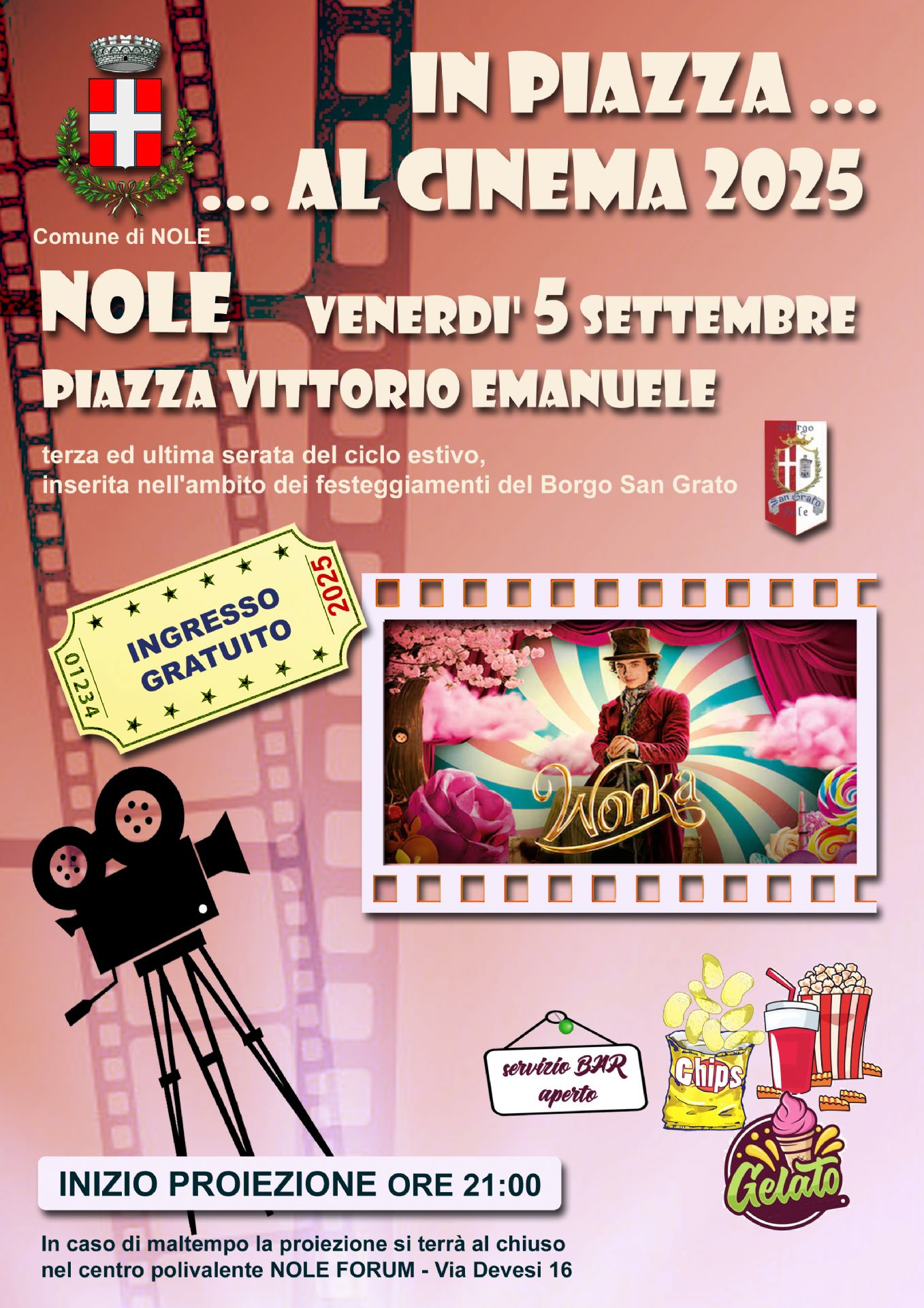 In caso di maltempo la proiezione si terrà al chiuso nel centro polivalente NOLE FORUM - Via Devesi 16