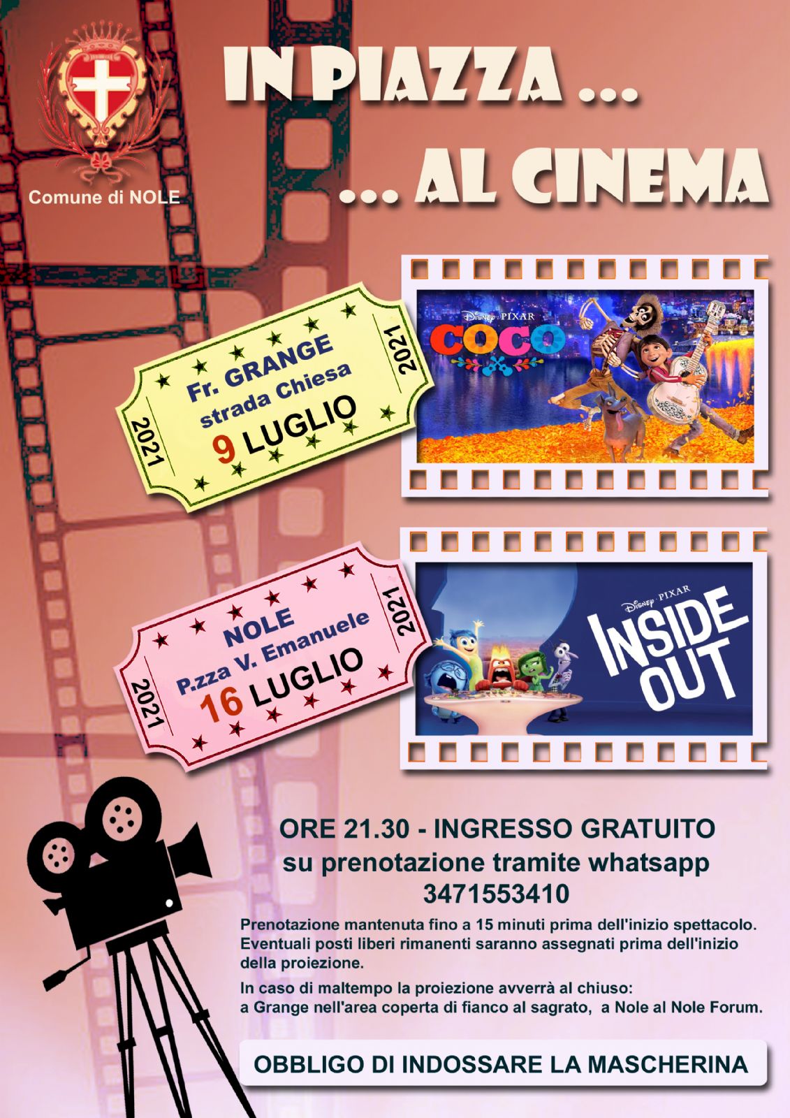 La rassegna prenderà il via alle ore 21.30 venerdì 9 luglio 2021 nella Frazione Grange di Nole, sul sagrato parrocchiale, con la proiezione del film Disney “COCO” e proseguirà venerdì 16 luglio 2021 a Nole in Piazza Vittorio Emanuele II sempre alle ore 21.30 con la proiezione del film Disney “INSIDE OUT”.