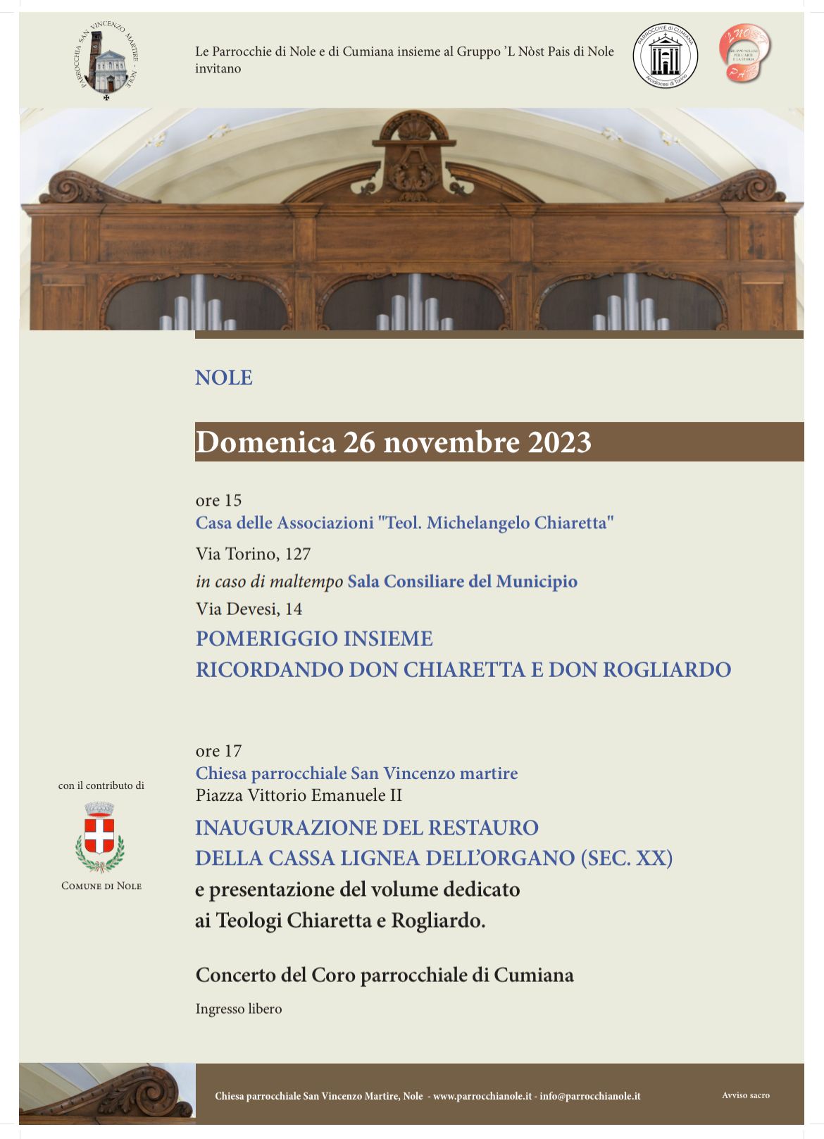 Si invita la Cittadinanza a partecipare all'inaugurazione del restauro della cassa lignea dell'organo.