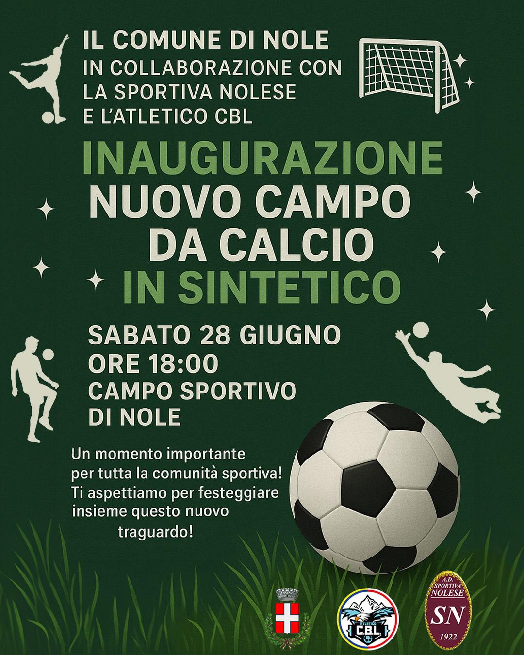 Il Comune di Nole in collaborazione con la sportiva Nolese e l'atletico CBL inaugura il nuovo campo da calcio in sintetico in Via Volontari del Sangue n. 6.