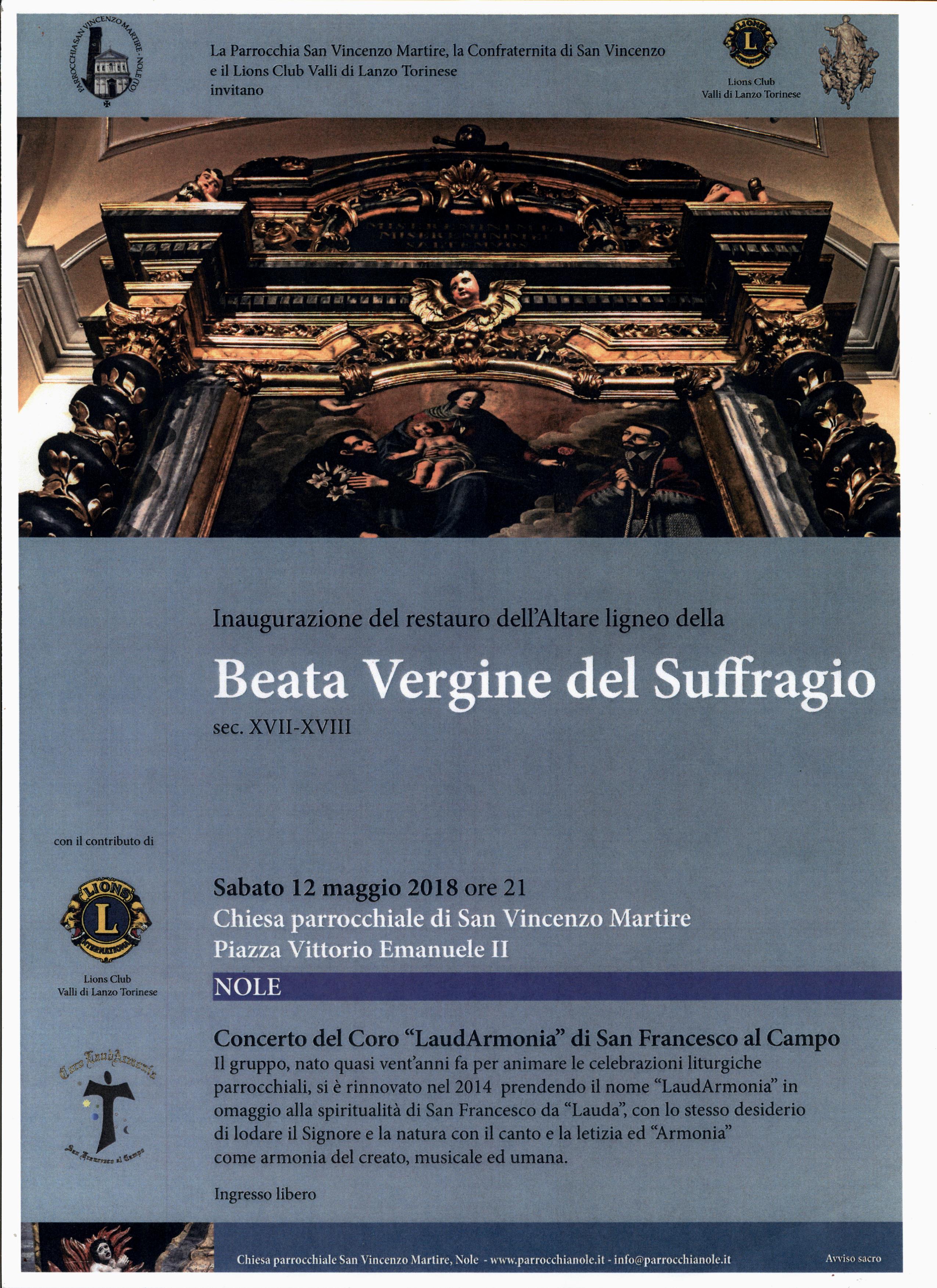 La Parrocchia di S.Vincenzo Martire, la Confraternita di S.Vncenzo ed il Lions Club delle Valli di Lanzo invitano all'inaugurazione del restauro dell'altare ligneo della Beata Vergine del Suffragio (sec. XVII - XVIII).
