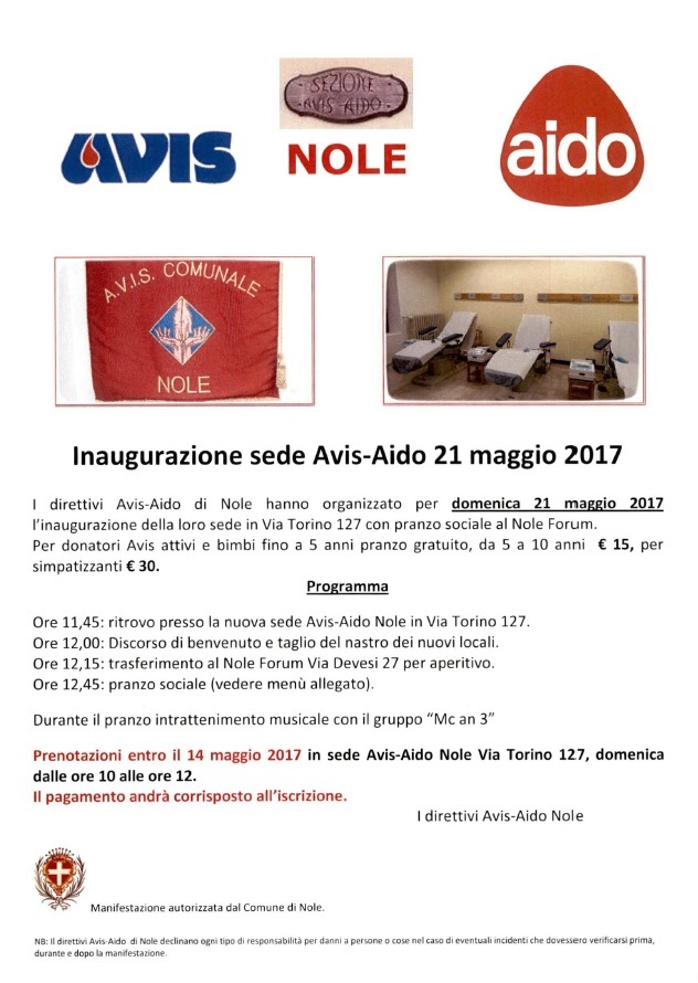 I direttivi AIDO e AVIS hanno organizzato per domenica 21 maggio 2017 l'inaugurazione della loro sede in via Torino 127 con pranzo presso la struttura polivalente "Nole Forum" di via Devesi.