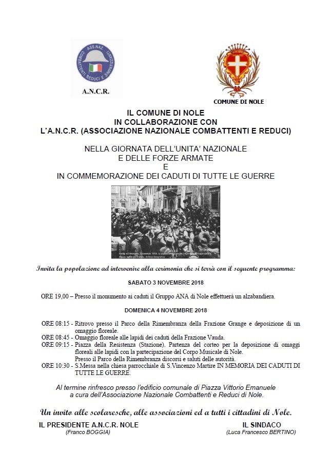 Il Com une di Nole, in collaborazione con l'A.N.C.R. (Associazione Nazionale Combattenti e Reduci), in occasione della Giornata Nazionale delle Forze Armate e in commemorazione dei caduti di tutte le guerre, invita la popolazione ad intervenire alla cerimonia che si terrà con il seguente programma:
