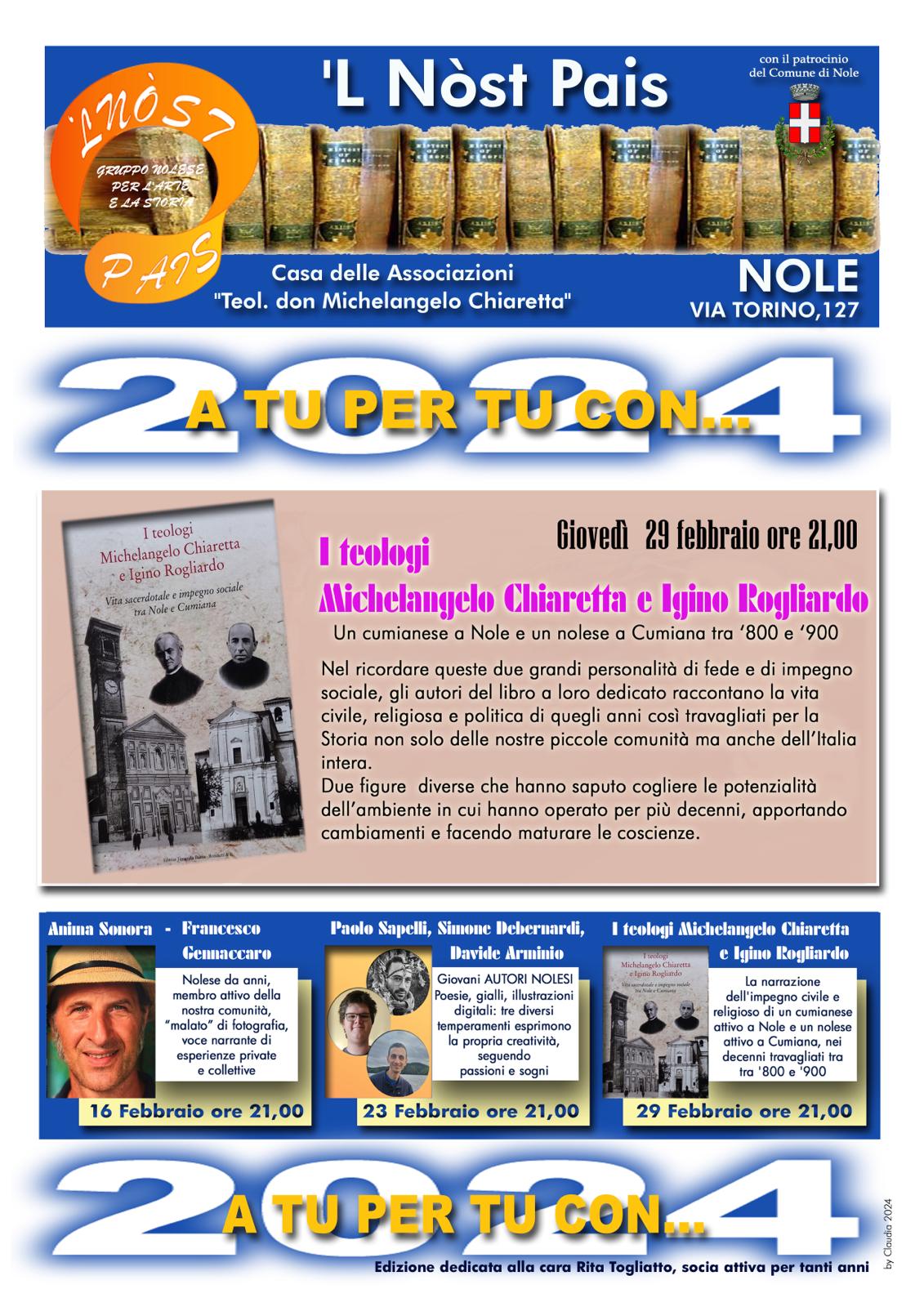 'L Nòst Pais è felice di invitarvi giovedì 29 febbraio all'ultimo incontro delle serate "A tu per tu con..." due teologi: un cumianese a Nole e un nolese a Cumiana.