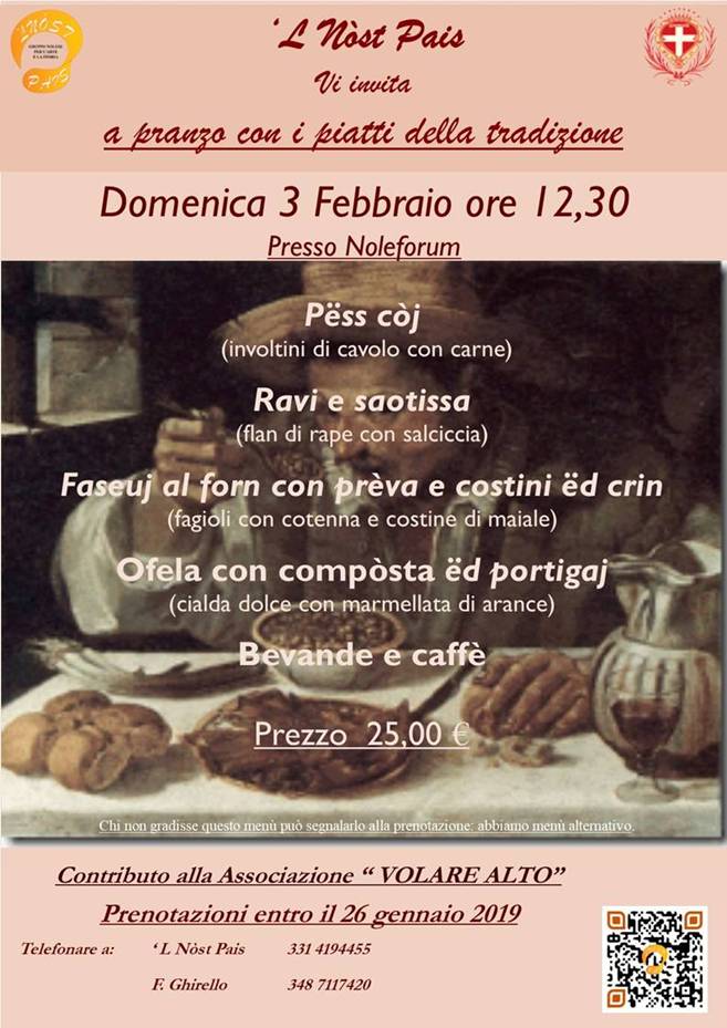'L Nòst Pais, gruppo nolese per l'arte e la storia, nell'ambito delle iniziative per il 25° della fondazione invita a partecipare al pranzo con i piatti tipici della tradizione.