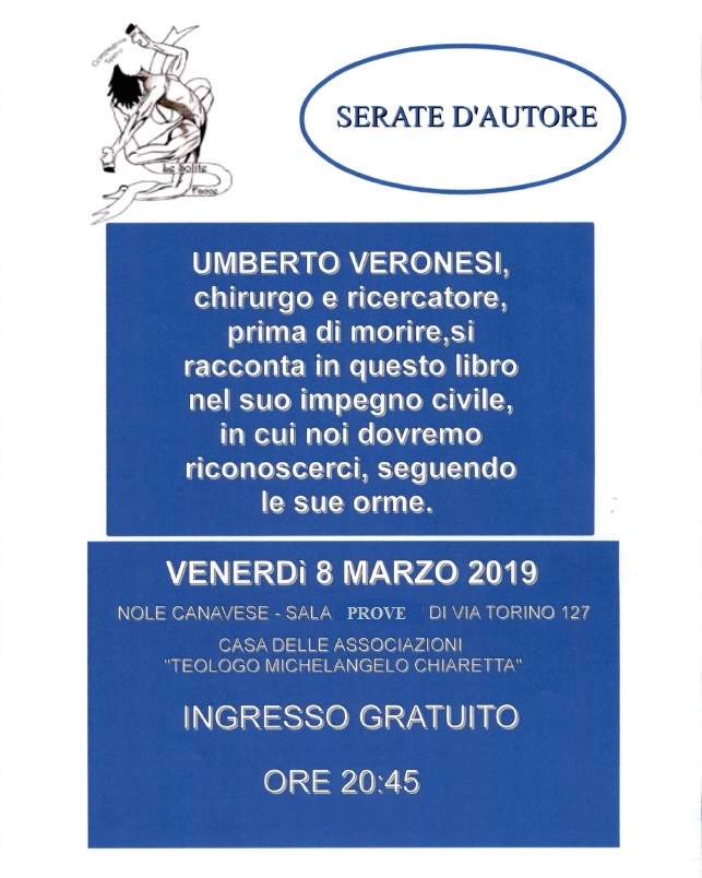 Per "Serate d'autore", la compagnia teatrale "Le solite facce" presenta "Umberto Veronesi". Chirurgo e ricercatore, prima di morire si racconta in questo libro nel suo impegno civile, in cui noi dovremmo riconoscerci, seguendo le sue orme".