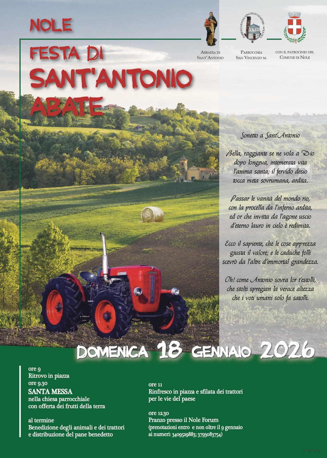 L’iniziativa è promossa dall’Abbadia di Sant’Antonio e dalla Parrocchia San Vincenzo Martire, con il patrocinio del Comune di Nole e la collaborazione della Pro Loco di Nole. La giornata prenderà il via alle 9 con il ritrovo in piazza Vittorio Emanuele II. Alle 9,30 seguirà la Santa Messa nella chiesa parrocchiale, accompagnata dall’offerta dei frutti della terra. Al termine della celebrazione spazio alla benedizione degli animali e dei mezzi agricoli e alla distribuzione del pane benedetto, momenti simbolici che rinnovano il legame tra comunità, lavoro e territorio. A partire dalle 11, la festa proseguirà con il rinfresco e la sfilata dei trattori lungo le vie del paese, offrendo un’occasione di incontro e partecipazione aperta a tutta la cittadinanza. Tutti a tavola dalle 12,30 al NoleForum (via Devesi 18) con il tradizionale Pranzo di Sant’Antonio, promosso dalla Pro Loco di Nole. Il menù prevede una proposta per adulti al costo di 35 euro e una per bambini a 13 euro; sono inclusi vino, acqua, caffè e digestivi. Le prenotazioni per il pranzo sono aperte fino a martedì 13 gennaio, contattando i numeri 340.9529883 e 379.3083754.
