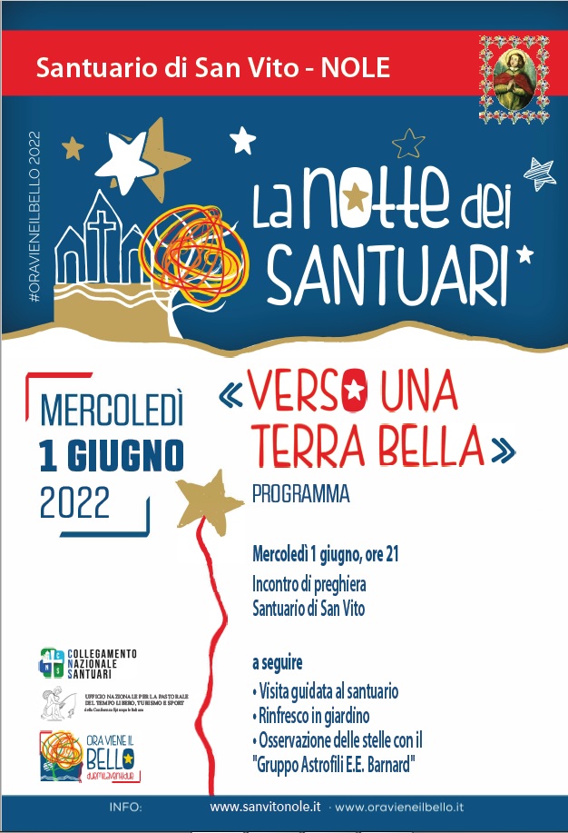 Mercoledì 1° giugno 2022 "La notte dei santuari", "Verso una terra bella". Ore 21,00 incontro di preghiera presso il santuario di San Vito. A seguire, visita guidata al santuario, rinfresco in giardino, osservazione delle stelle con il "Gruppo Astrofili E.E. Barnard."