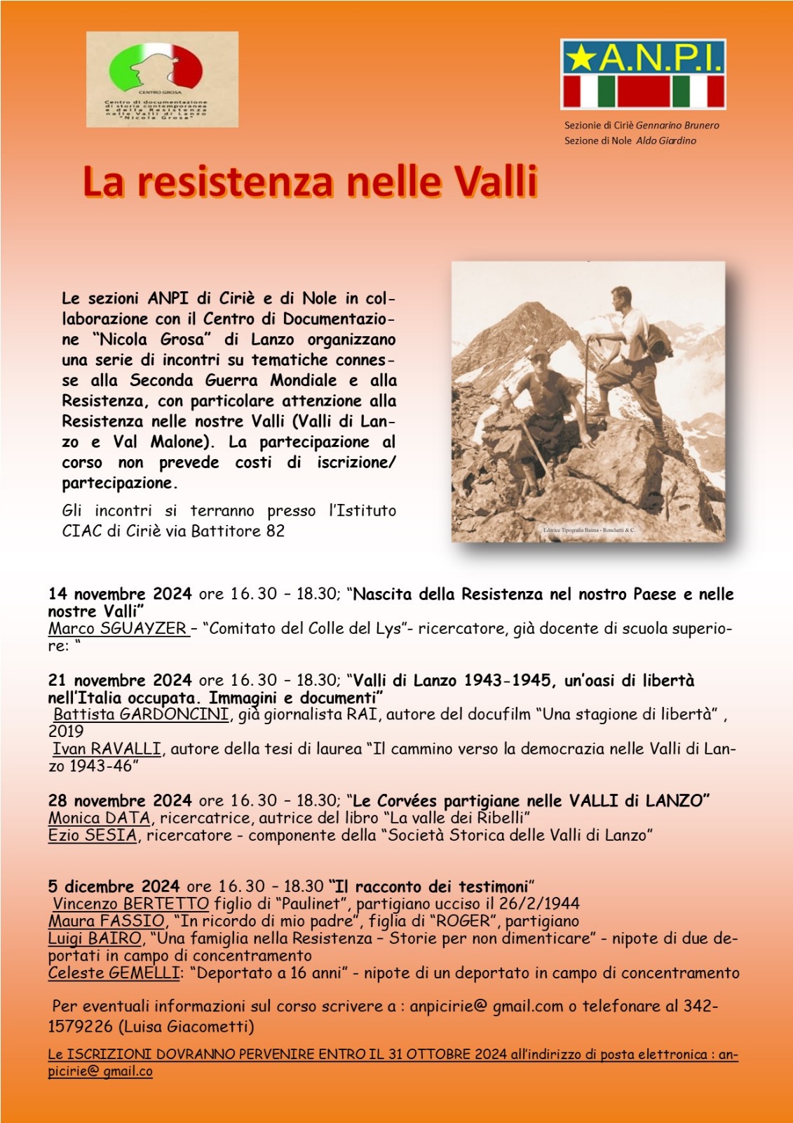 Le Sezioni ANPI di Ciriè e di Nole, organizzano una serie di incontri su tematiche connesse alla Seconda Guerra Mondiale e alla Resistenza. Gli incontri si terranno presso il CIAC di Ciriè.