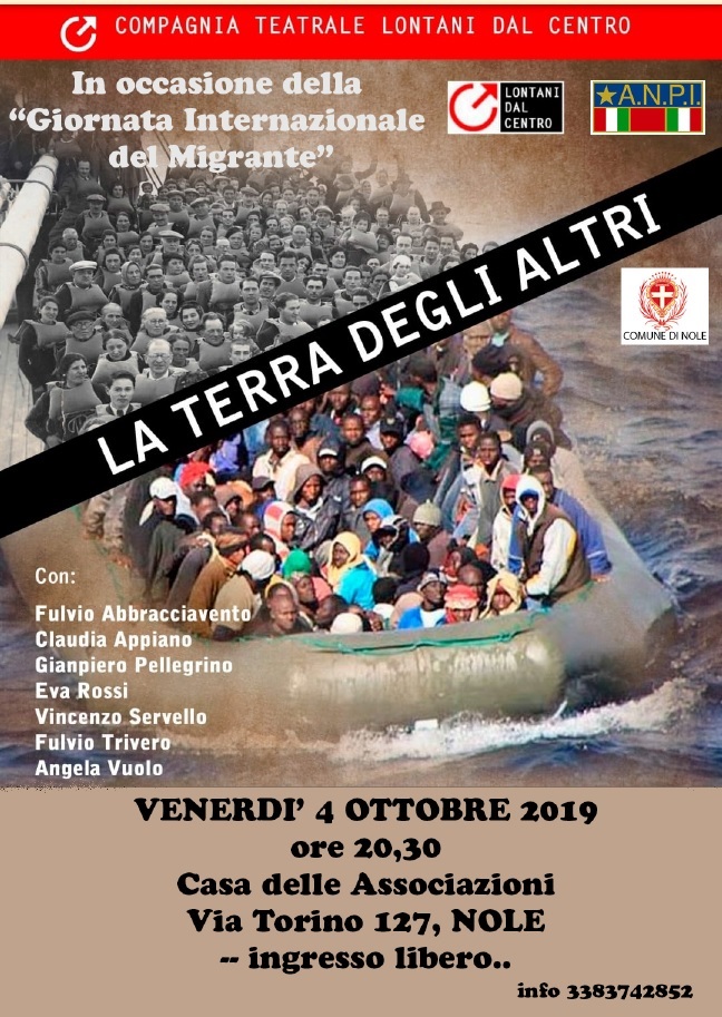 L'ANPI organizza, in occasione della "Giornata Internazionale del Migrante" "La terra degli altri", con la compagnia teatrale "Lontani dal centro". Parteciperanno Fulvio Abbracciavento, Claudia Appiano, Gianpiero Pellegrino, Eva Rossi, Vincenzo Servello, Fulvio Trivero, Angela Vuolo.