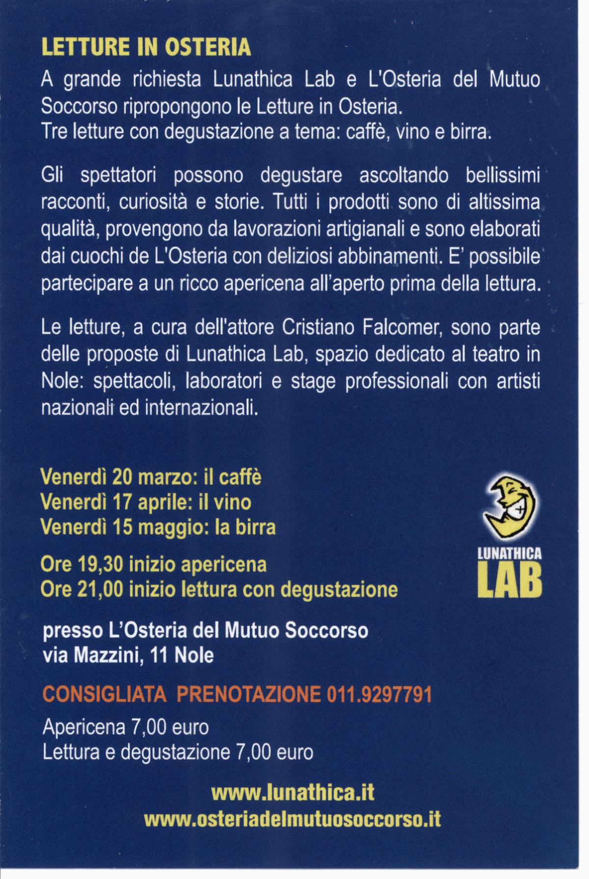Lunathica Lab e l'Osteria del Mutuo Soccorso ripropongono le "LETTURE IN OSTERIA", tre appuntamenti culturali-conviviali presso l'Osteria del Mutuo Soccorso di via Mazzin i 11. Letture a cura di Cristiano Falcomer.