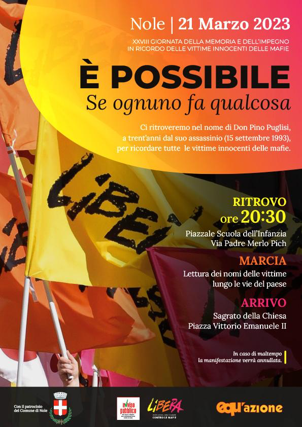 Il Comune di Nole unitamente all’associazione Equ’Azione in occasione della XXVIII giornata della memoria e dell’impegno in ricordo di tutte le vittime innocenti delle mafie, invitano tutte le associazioni a partecipare alla Marcia che si svolgerà il 21 marzo 2023 alle 20,30 attraverso le vie del paese.