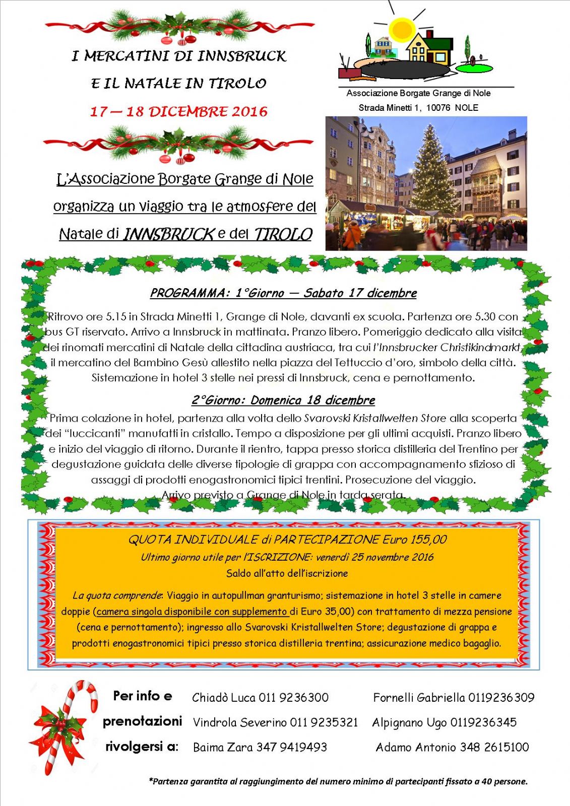 L'Associazion e delle Borgate di Grange di Nole organizza un viaggio tra le atmosfere natalizie di Innsbruck e del Tirolo per sabato 17 e domenica 18 dicembre 2016.