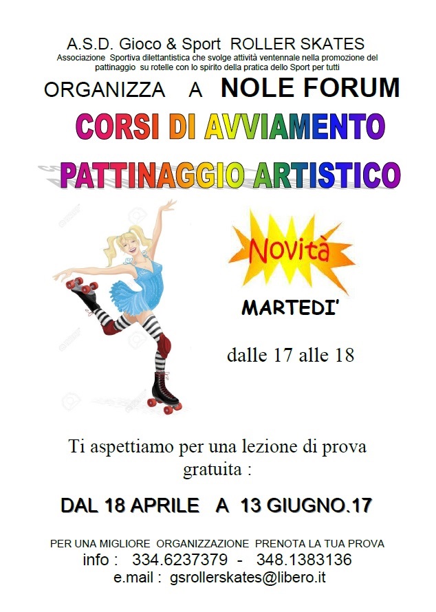 L'A.S.D. GIOCO & SPORT ROLLER SKATES organizza i nuovi corsi di avviamento al pattinaggio artistico con una lezione di prova gratuita dal 18 aprile al 13 giugno 2017 presso il "Nole Forum" di via Devesi (ex Erber) il martedì dalle 17 alle 18.