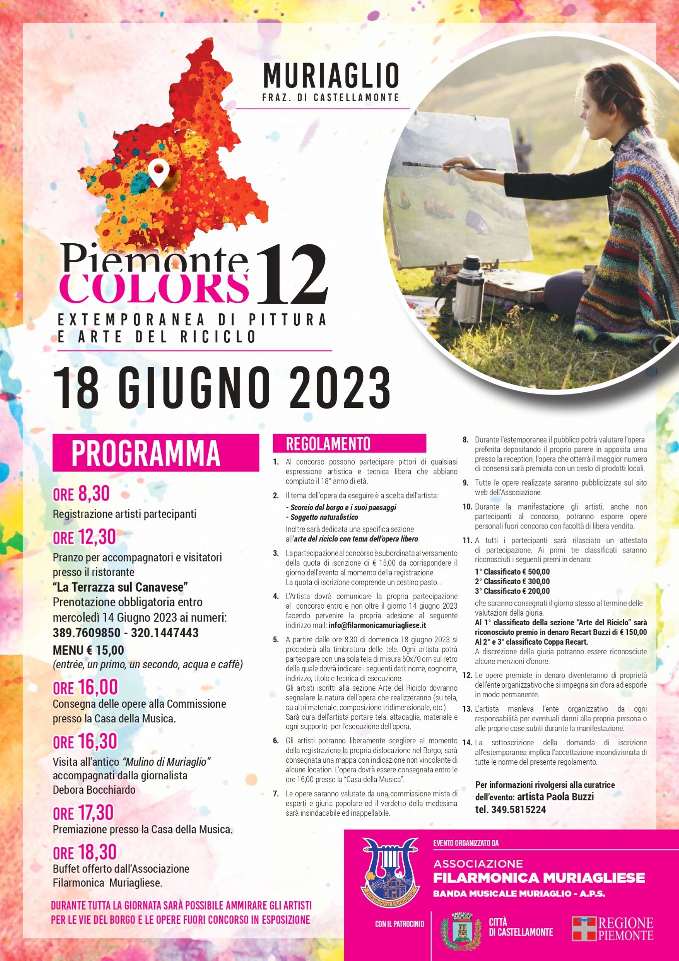 La Filarmonica Muriagliese A.P.S., organizza con il patrocinio della Città di Castellamonte, Domenica 18 giugno 2023 a Muriaglio Canavese, frazione a 7 Km da Castellamonte, la seconda edizione dell' Extemporanea d'Arte: una giornata dedicata alla pittura ed all'arte (riciclo) nelle vie del nostro Borgo medievale, alla riscoperta di angoli caratteristici e paesaggi dai mille colori.
