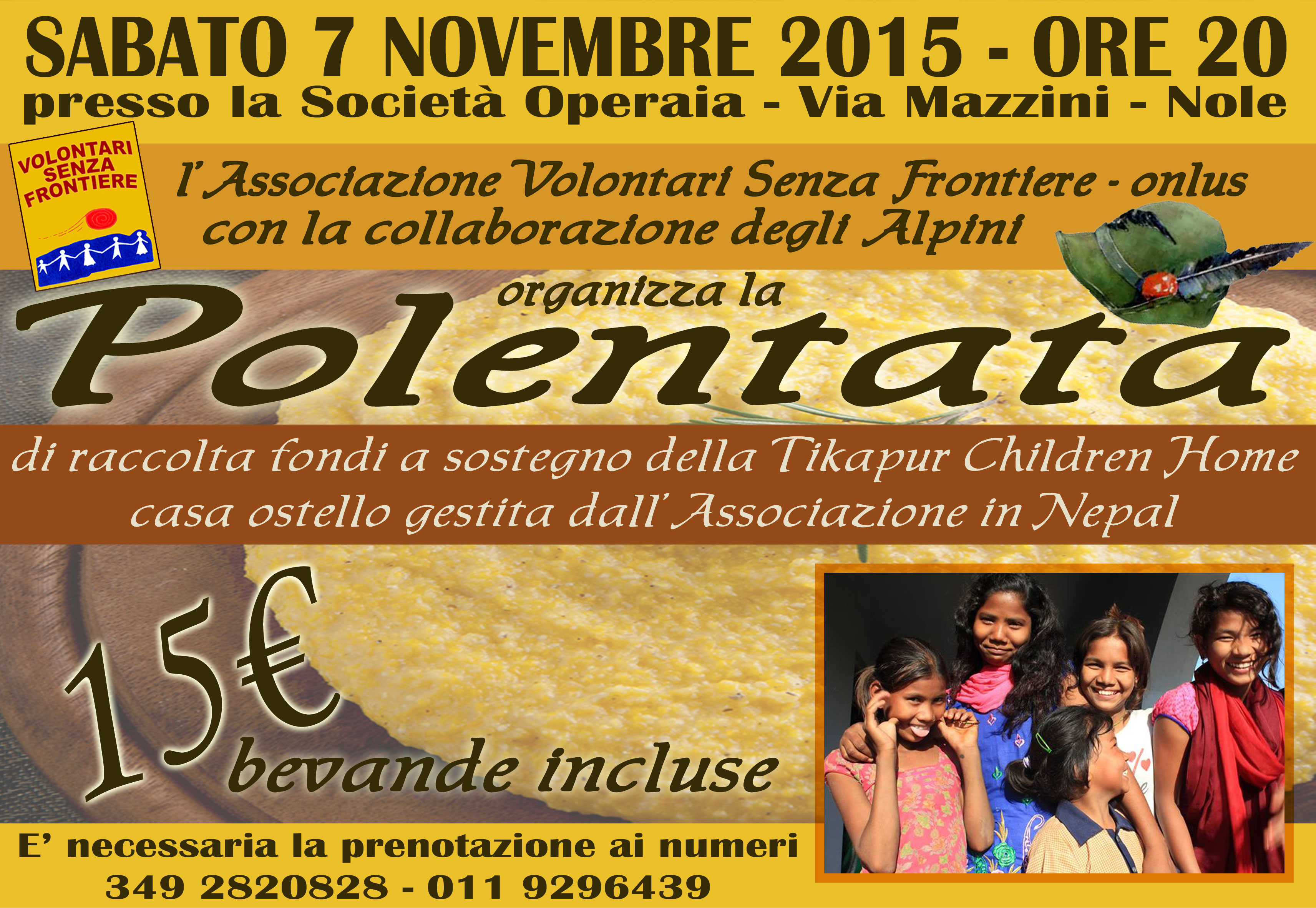 L'associazione volontari senza frontiere, con la collaborazione dell'ANA gruppo di Nole, organizza sabato 7 novembre 2015 alle ore 20,00 la polentata di raccolta fondi a sostegno della Tikapur Children home (casa ostello in Nepal).
