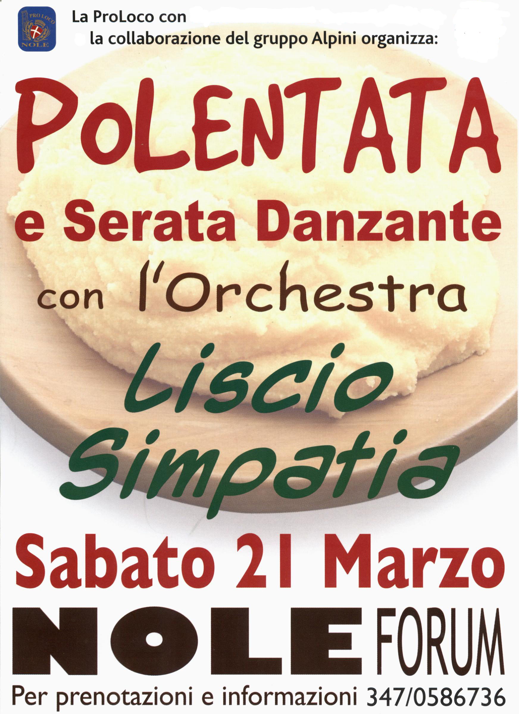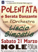 La Pro Loco di Nole, in collaborazione con gli Alpini, organizza la polentata e serata danzante con l'orchestra "Liscio simpatia", sabato 21 marzo presso il Nole forum ("ex Erber") di via Devesi.