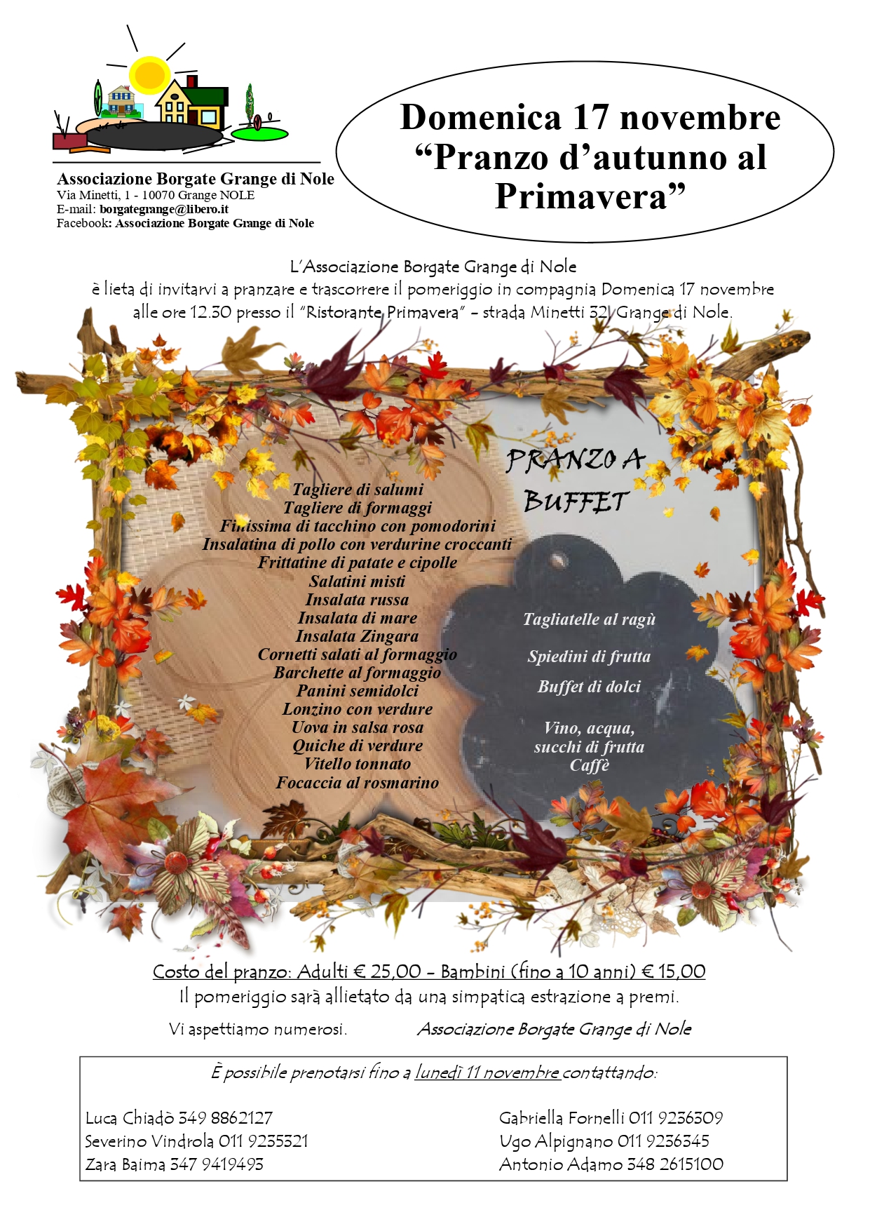 L'Associazione delle Borgate di Grange di Nole invita tutti a partecipare al consueto "Pranzo d'autunno al Primavera".
