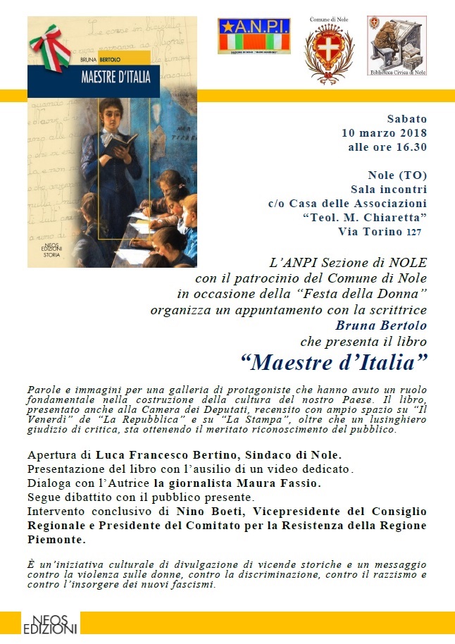L'ANPI sezione di Nole, in occasione della giornata internazionale della donna, organizza la presentazione del libro "Maestre d'Italia" di Bruna Bertolo.