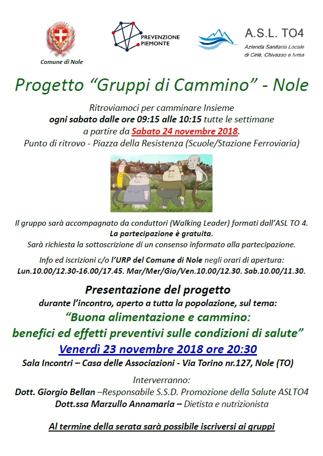 Ci ritroveremo per camminare insieme ogni sabato dalle ore 9:15 alle 10:15 a partire da Sabato 24 novembre 2018. Punto di ritrovo - Piazza della Resistenza (Scuole/Stazione Ferroviaria). Il gruppo sarà accompagnato da conduttori (Walking Leader) formati dall’ASL TO 4.