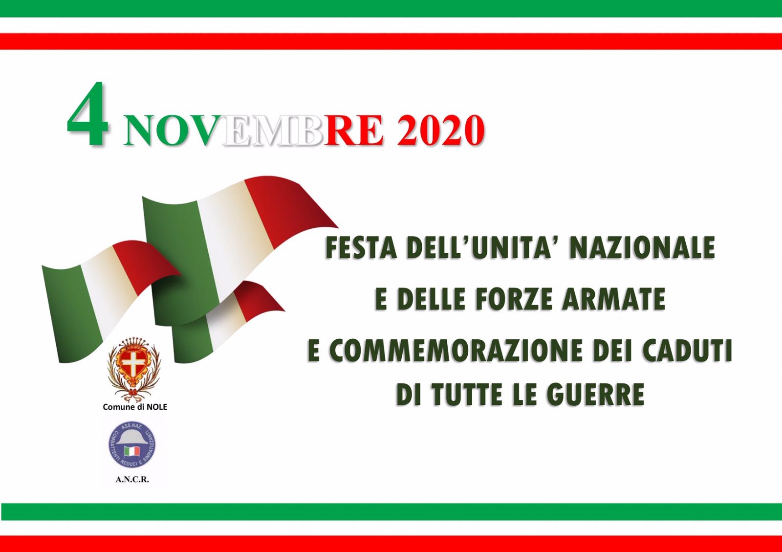 L’Amministrazione di Nole con l’A.N.C.R. locale celebreranno comunque domenica 8 novembre 2020 il ricordo di questa importante giornata con una cerimonia ristretta e non aperta al pubblico, nel rispetto delle disposizioni vigenti, ma in condivisione con la cittadinanza attraverso una programmazione digitale.
