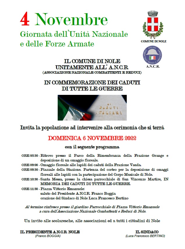IL COMUNE DI NOLE, UNITAMENTE ALL’ A.N.C.R. (ASSOCIAZIONE NAZIONALE COMBATTENTI E REDUCI) IN COMMEMORAZIONE DEI CADUTI DI TUTTE LE GUERRE