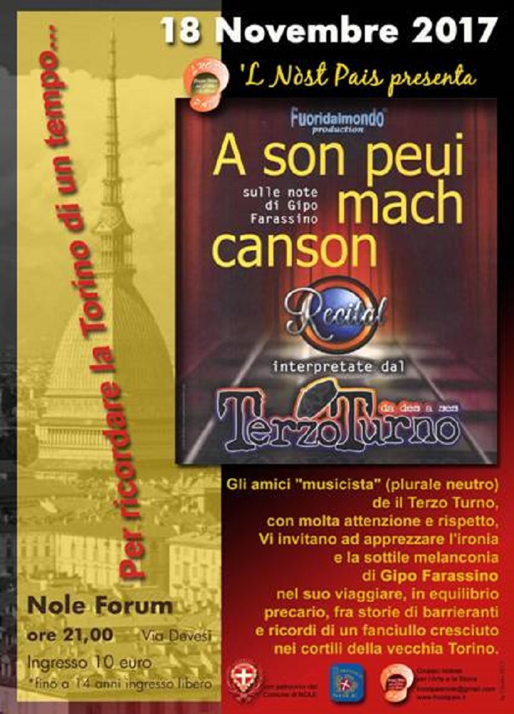 Il gruppo nolese per l'arte e la storia " 'L Nòst Pais", con la partecipazione della Pro Loco Nole e del Comune di Nole, organizza una serata recital sulle note di Gipo Farassino interpretate da "Terzo Turno".