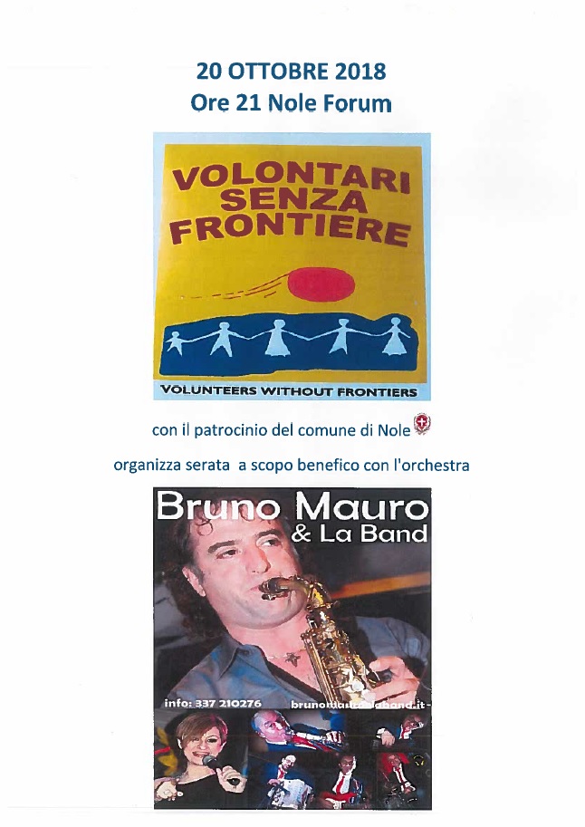 L'Associazione Volontari Senza Frontiere organizza per sabato 20 ottobre 2018 alle ore 21,00 una serata danzante a scopo benefico con "Bruno Mauro & La Band".