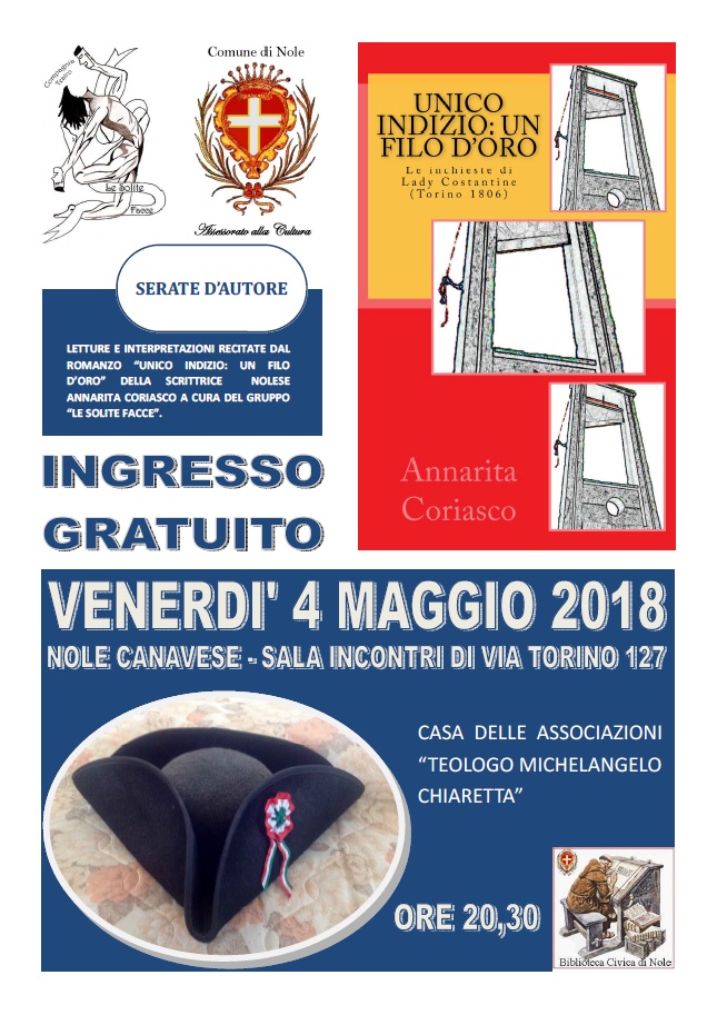 Nell'ambito di "Serate d'autore", il gruppo teatrale "Le solite facce", con la collaborazione del Comune di Nole e della Biblioteca Civica presenta letture e interpretazioni recitate (con commento musicale) di brani tratti dal romanzo "UNICO INDIZIO: UN FILO D'ORO", giallo storico della scrittrice nolese Annarita Coriasco.