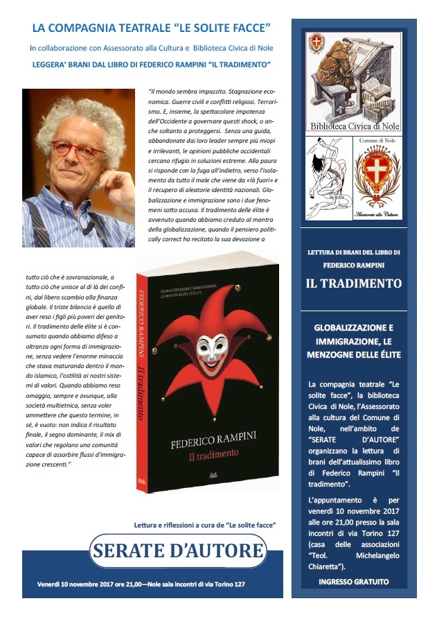 La compagnia teatrale “Le solite facce”, la biblioteca Civica di Nole, l’Assessorato alla cultura del Comune di Nole, nell’ambito de “SERATE D’AUTORE” organizzano la lettura di brani dell’attualissimo libro di Federico Rampini “Il tradimento”.