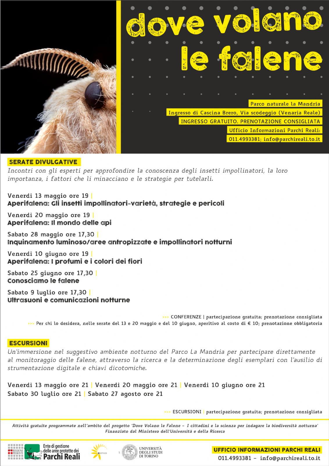 L'Ente di gestione delle aree protette dei parchi reali organizza "Dove volano le falene", una serie di serate divulgative dal 13/5 al 9/7 e di escursioni dal 13/5 al 27/8.